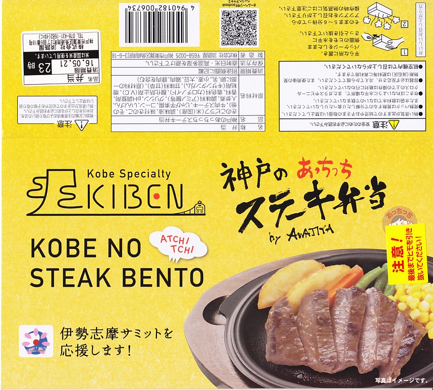 2016(平成28)年5月20日頃の調製と思われる、新神戸駅弁のパッケージ。伊勢志摩サミットの開催を記念して、仙台駅から小倉駅まで11種類の駅弁について、パッケージに駅弁の名前の英文表記とほぼ共通のロゴマークを印刷し、東京駅の駅弁売店で販売した。価格と中身は通常版と同じ。