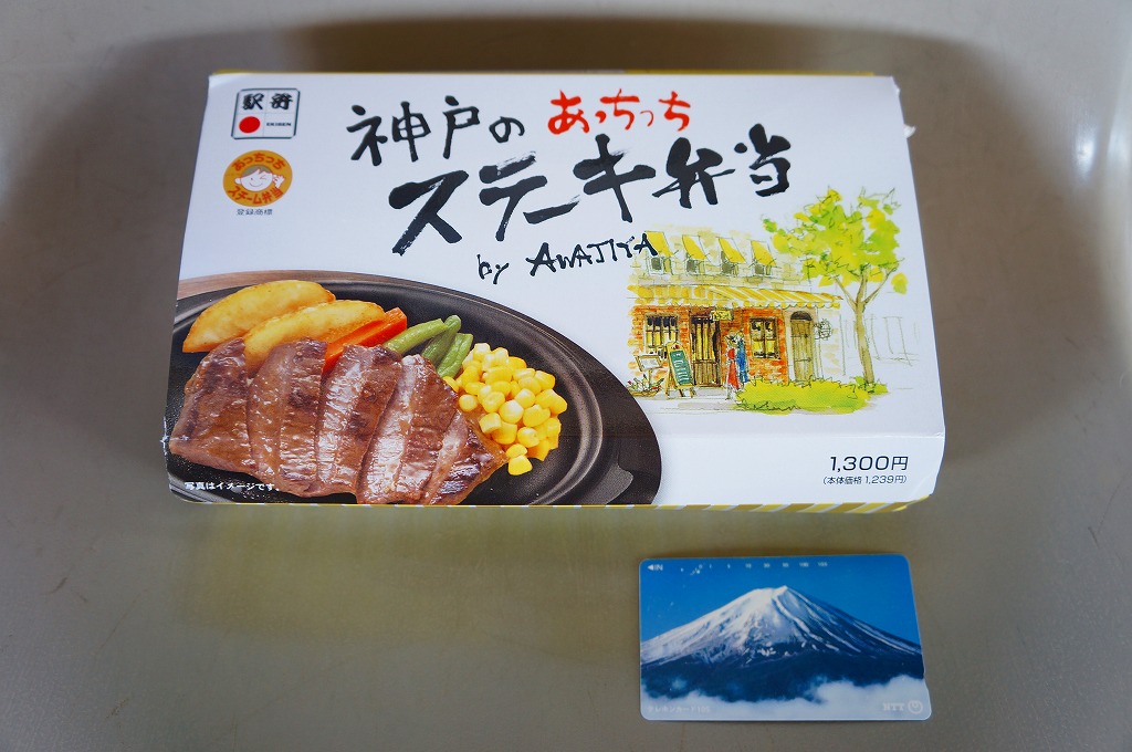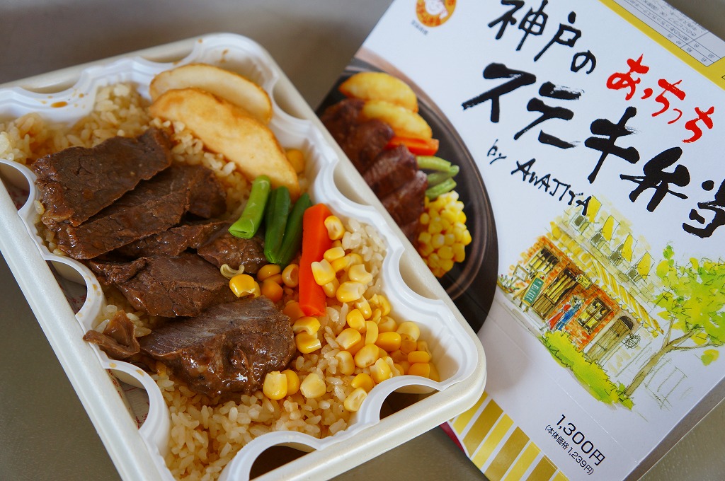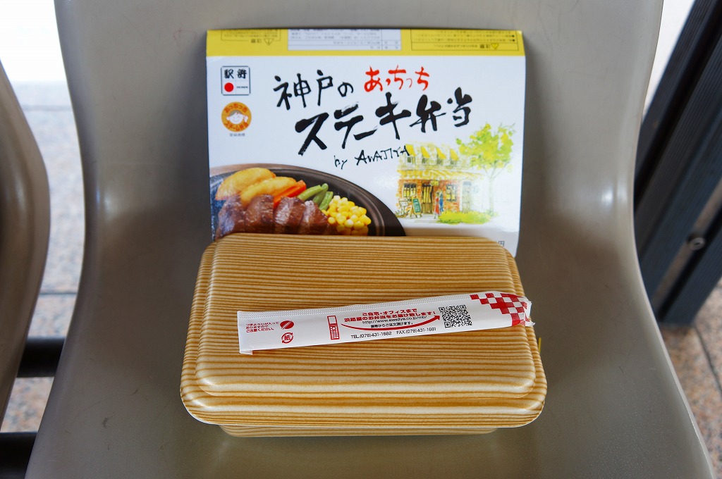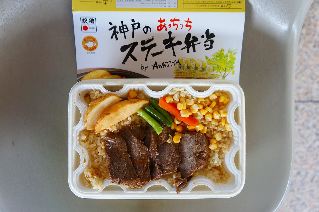 2012(平成24)年8月に発売か。神戸の駅弁で「あっちっち」と「ステーキ弁当」との組合せが今までなかったことは盲点だった。ボール紙のパッケージは「あっちっち」でない神戸のステーキ弁当と同じ意匠。長方形の加熱機能付き容器にきのこピラフを敷き、牛肉ステーキを載せ、コーン、ポテトフライ、いんげん、ニンジン煮を添えるもの。赤身だけで歯応えと柔らかさと香りと風味を出すステーキ肉は、170種類もの駅弁を集めたというこの駅弁売店にもライバルはいない味。価格は2012年の発売時や購入時で1,300円、2014年4月の消費税率改定で1,330円、2016年時点で1,350円、2022年3月から1,380円、2023年時点で1,420円、2024年時点で1,580円。