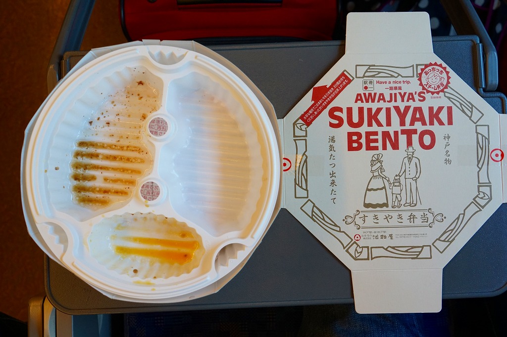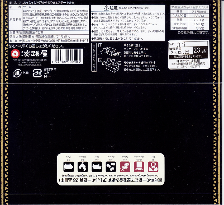 価格は2014年の購入時で1,130円。2016年秋に「AWAJIYA’S TAJIMA BEEF SUKIYAKI BENTO(あっちっち但馬牛すきやき弁当)」(1,400円)へ改称し値上げ。価格は2022年3月から1,440円。
