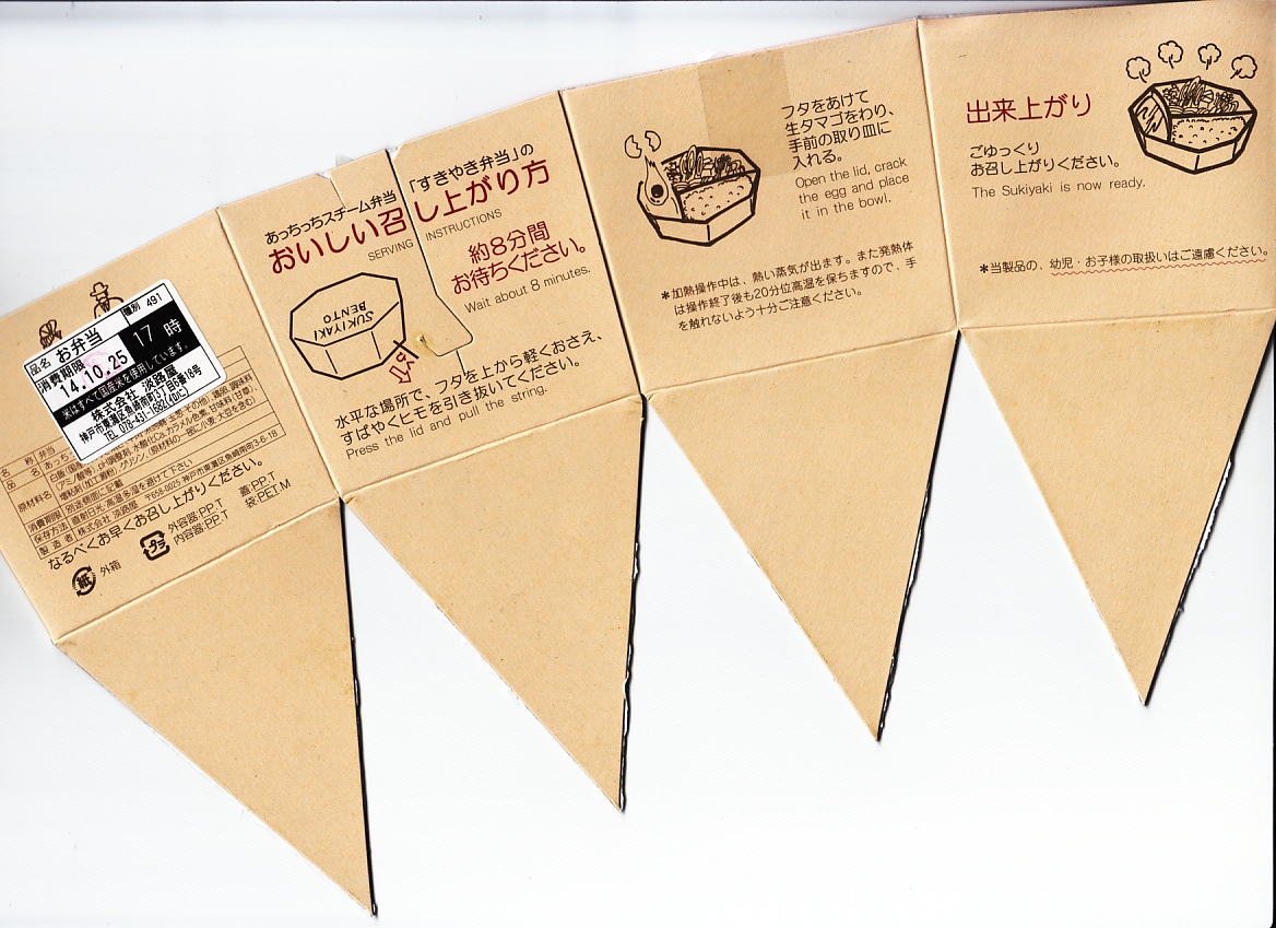 1988(昭和63)年の発売。大きく丸い容器の中身は御飯と牛すき焼きにカイワレなどの薬味と生卵。もちろん暖めてすき焼きとして食べるのだが、生卵がゆで卵になっては困るので卵は暖まらない工夫を凝らしてある。