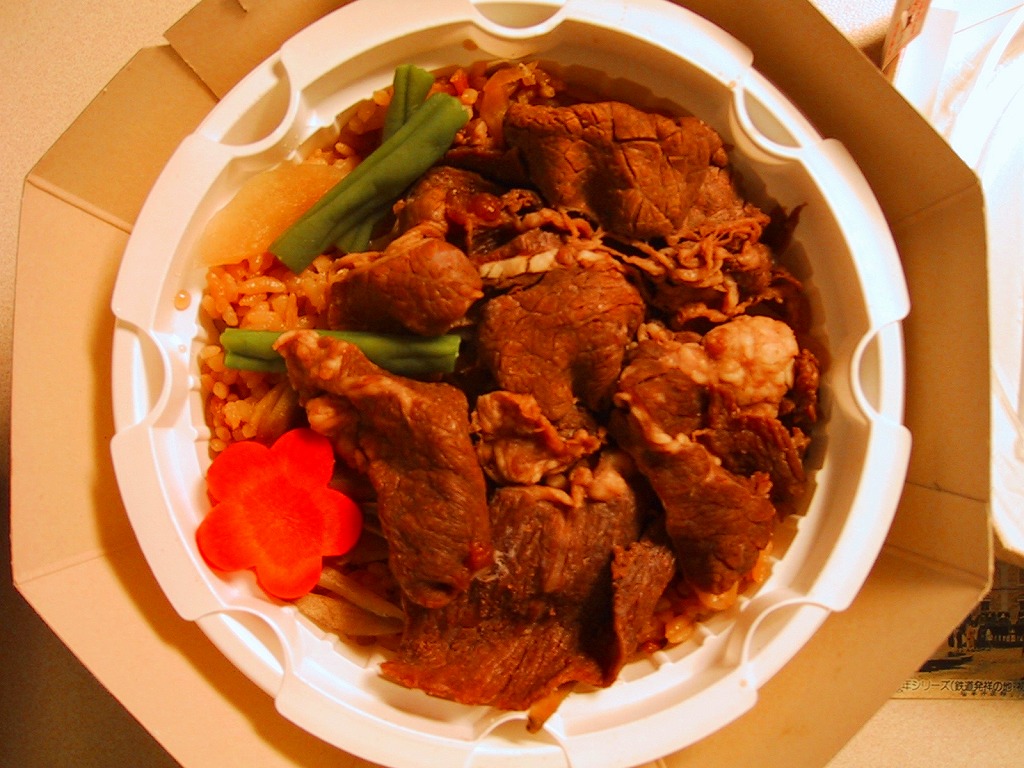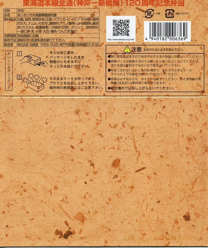 2009(平成21)年8月3日に発売か。東海道本線全通(神戸−新橋間)120周年記念弁当の副題が付いている。加熱機能付き容器の駅弁ではあまり見ない、長方形の容器に加熱機能をぴったり埋め込んだ容器を使用、中身のイメージや駅弁の名前を描いたボール紙の枠にはめる。中身は白御飯の上に牛焼肉とピーマン炒めともやし炒めを乱雑に載せるもので、タレが袋で添付される。悪気はないが、臭め固めのパサついた牛肉の風味が個性的。