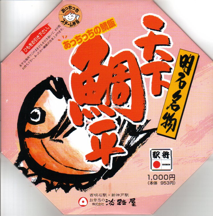 2002(平成14)年に「明石鯛好きめでっ鯛飯」の姉妹品として発売。すり鉢型の八角柱ボール紙製容器の中に、加熱材を底に埋め込んだ円形のプラスティック製容器。中身はめでっ鯛飯と共通で、茶飯の上に錦糸というには太い卵と、鱈の子を混ぜた芽昆布、そして小鯛酒蒸の切り身が3切れ載る。容器側面の黄色いひもを引けば盛大に蒸気が出て8分程度で暖まる。鯛はとても美味いが、芽昆布の着色料はなんとかならないものか。現在は販売されていない模様。