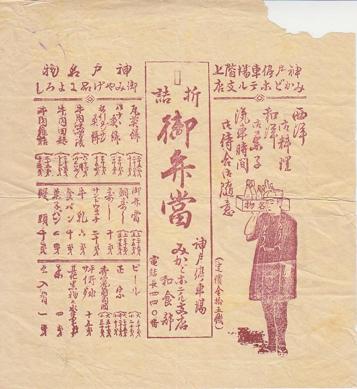 明治時代のものと思われる、昔の神戸駅弁の掛紙。商品名と価格、調製元の営業品目、販売品目とその価格、販売人の姿が、単色で描かれる。当時の価格として「御弁當 上25銭 並15銭」「鯛寿し 上30銭 並15銭」「寿し 10銭」「サンドウヰッチ 20銭」の価格が読み取れる。調製元のみかどホテルは、1901年または1906年に改称または増築した、神戸駅前の洋式旅館であり、神戸駅その他の構内食堂や列車食堂も営業した。