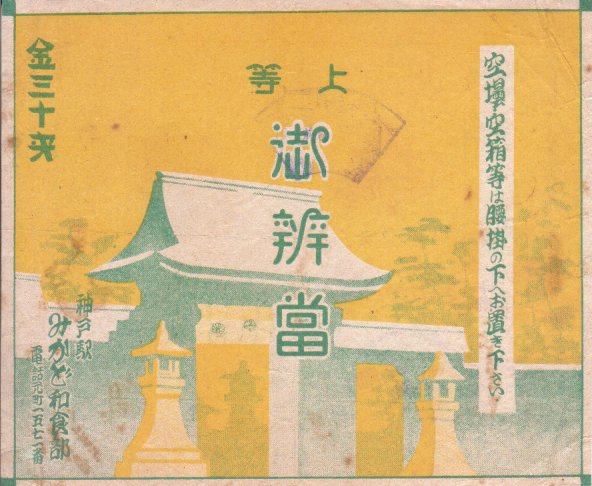 第二次大戦前の調製と思われる、昔の神戸駅弁の掛紙。調製印と思われる扇形のスタンプが押されているが、その内容は読み取れない。掛紙では神戸駅北徒歩3分の湊川神社を描いている模様。日本の鉄道開業と同じ年の明治5年(1872年)に創建された。