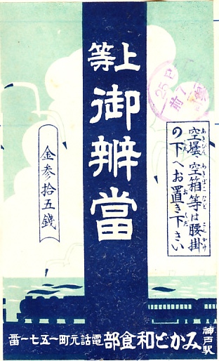 第二次大戦前の調製と思われる、昔の神戸駅弁の掛紙。絵柄は下記ものと同じで、色が異なる。何らかの使い分けがあったのだろうか。
