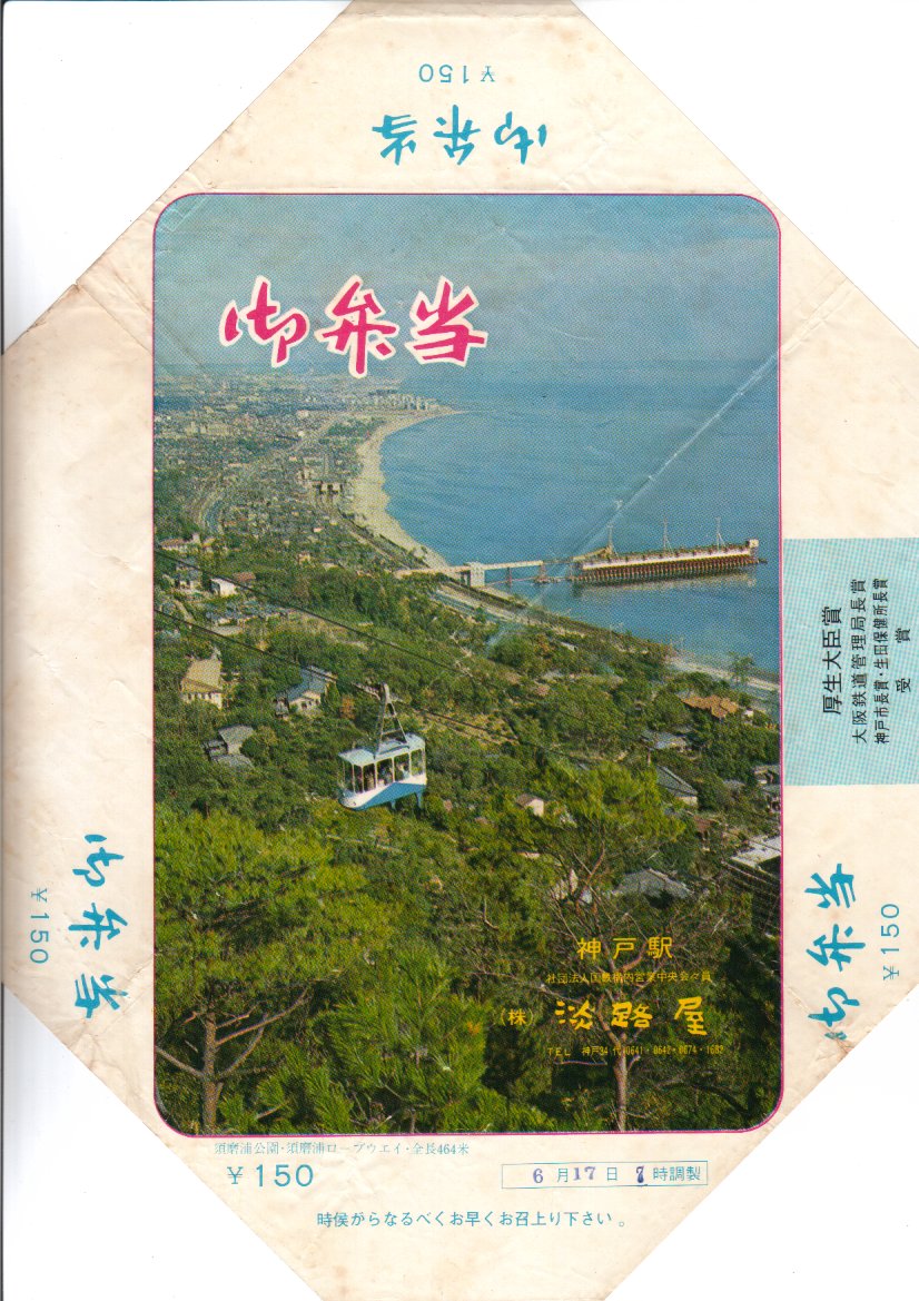 昭和40年代頃の調製と思われる、昔の神戸駅弁の掛紙。須磨浦公園ロープウェイの写真が載る。この画像や調製元の所在地に市外局番などから、調製年が特定できないであろうか。
