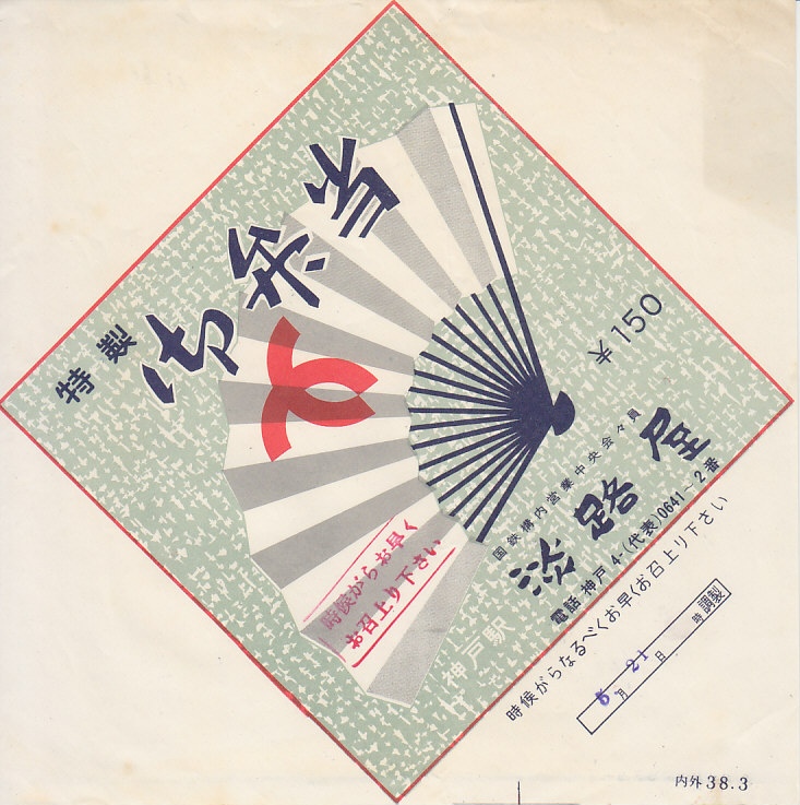 おそらく1963(昭和38)年5月21日(火)の調製と思われる、昔の神戸駅弁の掛紙。右下に「38.3」の印字があり、昭和38年3月の印刷物とみなした。扇に赤く描かれたマークは神戸市章。