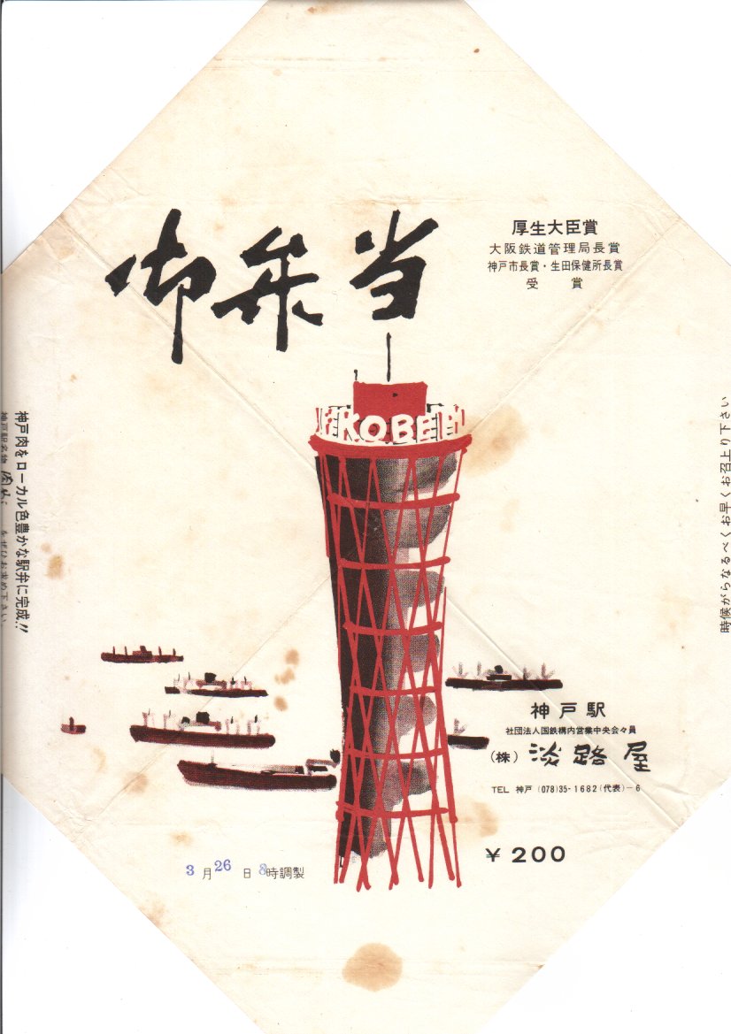 昭和40年代頃の調製と思われる、昔の神戸駅弁の掛紙。1963年竣工で現在も神戸名所のひとつである神戸ポートタワーのイラストが載る。右端に駅弁「肉めし」の誕生が伝えられるので、その発売年である1965年頃のものであろうか、右上部記載の受賞歴から年代を特定できないかと思う。