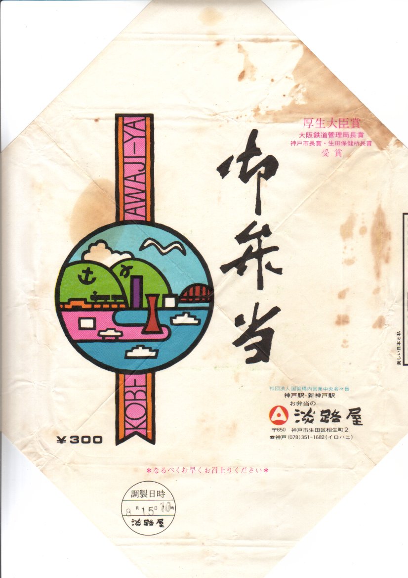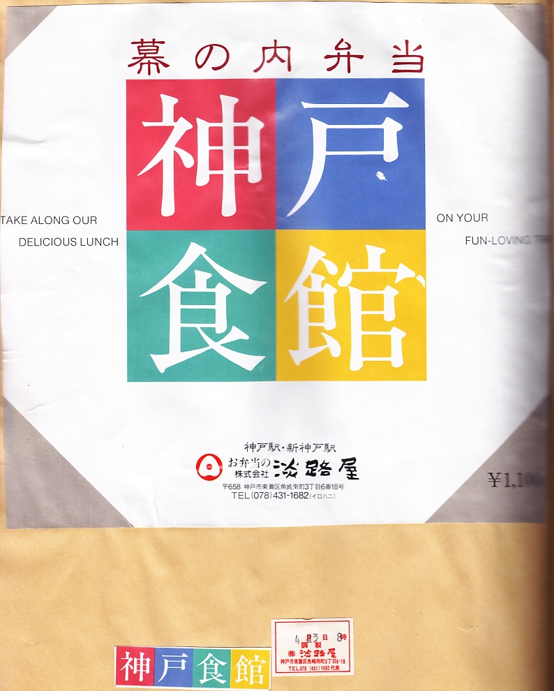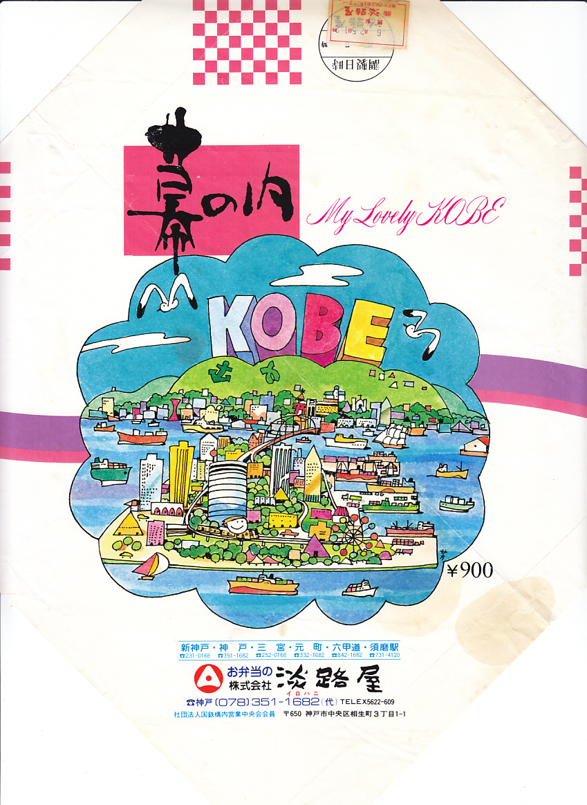 入手状況から1994(平成6)年4月23日8時の調製と思われる、昔の神戸駅弁の掛紙の一部。神戸の名所は描かれていない。当時のバブル経済に浮かれていない、シンプルな絵柄だと思う。