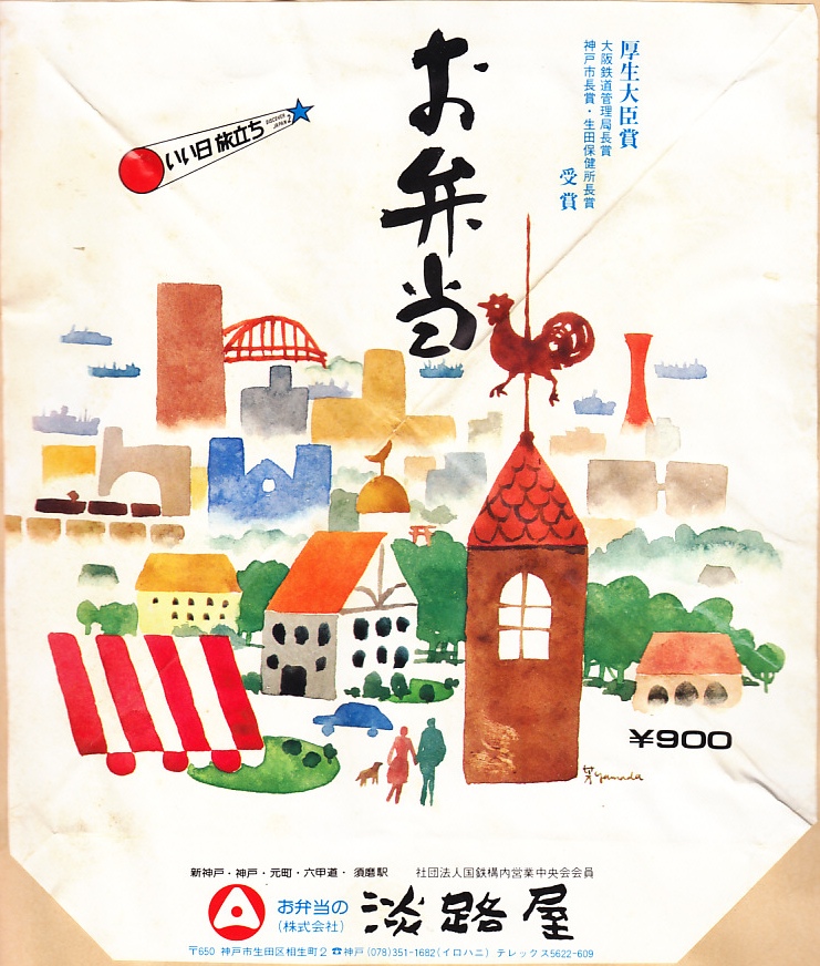 昭和40年代頃の調製と思われる、昔の神戸駅弁の掛紙。当時の神戸名所のイラストがスタンプ調にシンプルに描かれる。画像からは切れてしまっているが右端に1970年開始の国鉄の旅行キャンペーン「DISCOVER JAPAN」のマークがあること、1972年に開業した「新神戸駅」の記載があることから、同年以降の調製であると思われる。
