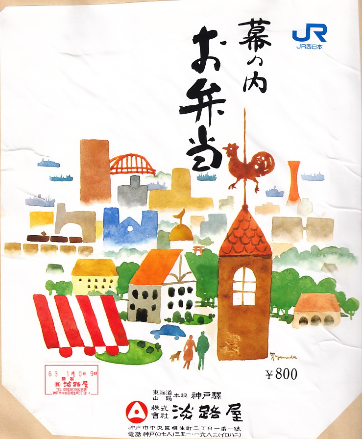 1988(昭和63)年1月10日9時の調製と思われる、昔の神戸駅弁の掛紙の一部。その絵柄は、下記の1979(昭和54)年のものと同じ。JR西日本のロゴマークが付くが、JR西日本が調製したものではない。1987(昭和62)年の国鉄分割民営化の頃は駅弁の掛紙に加え、JR各社が出したものではない市中の地図や広告などに、このJRマークが広く使われていた。