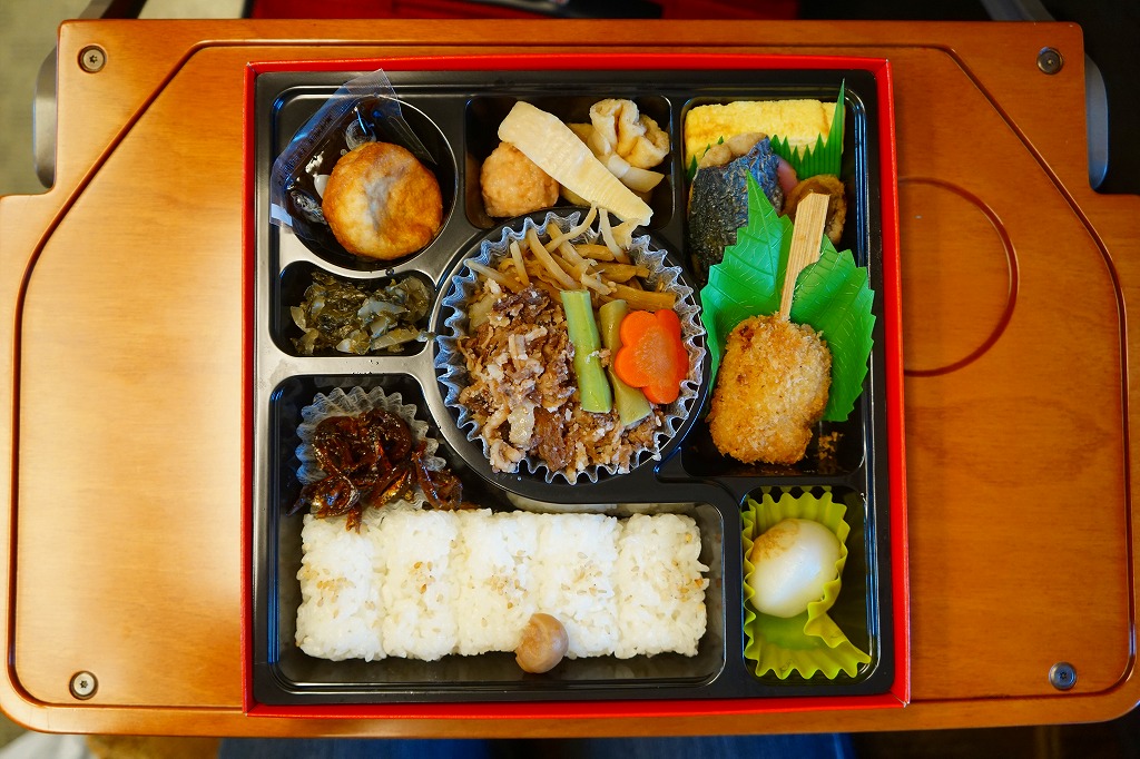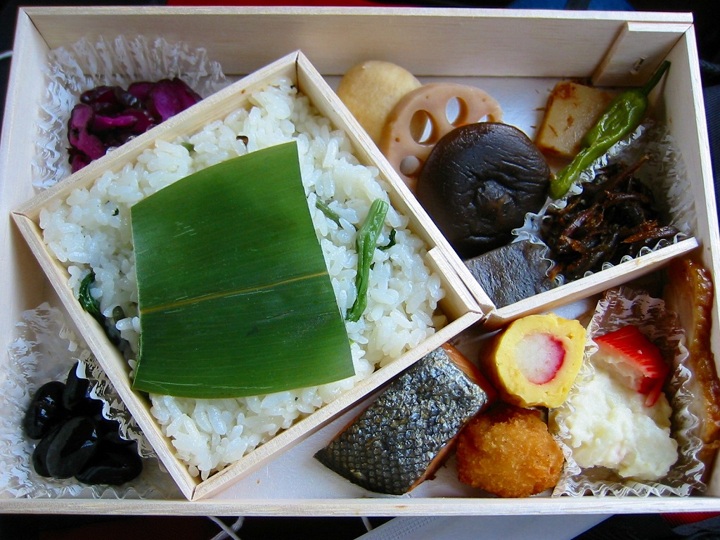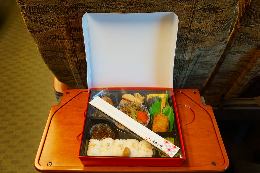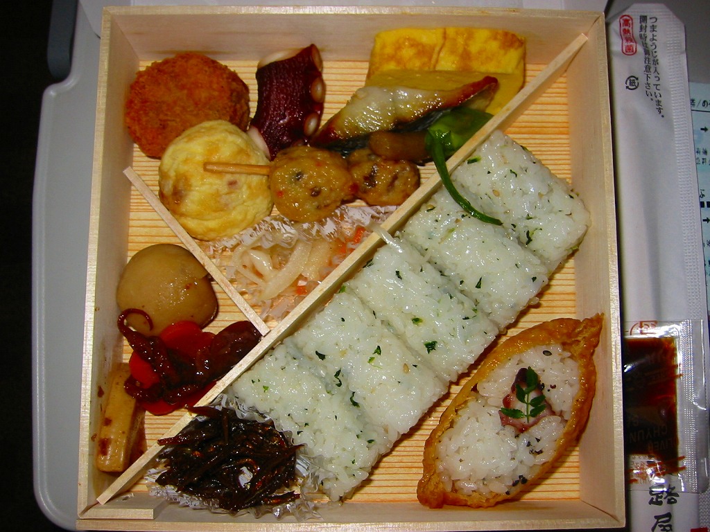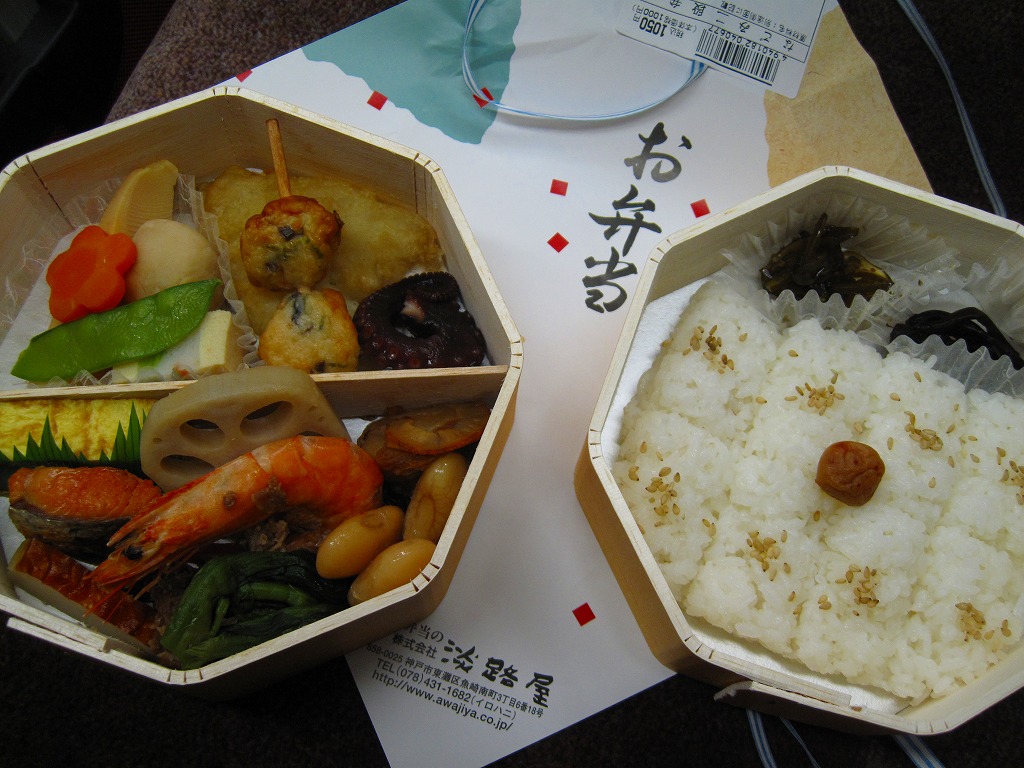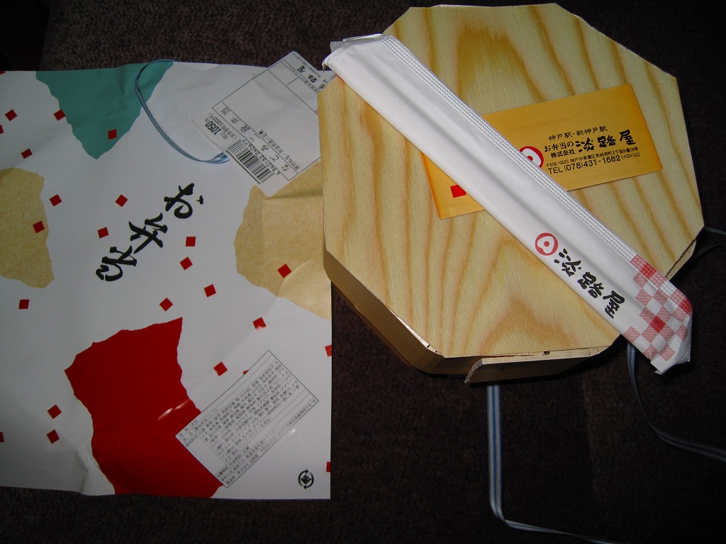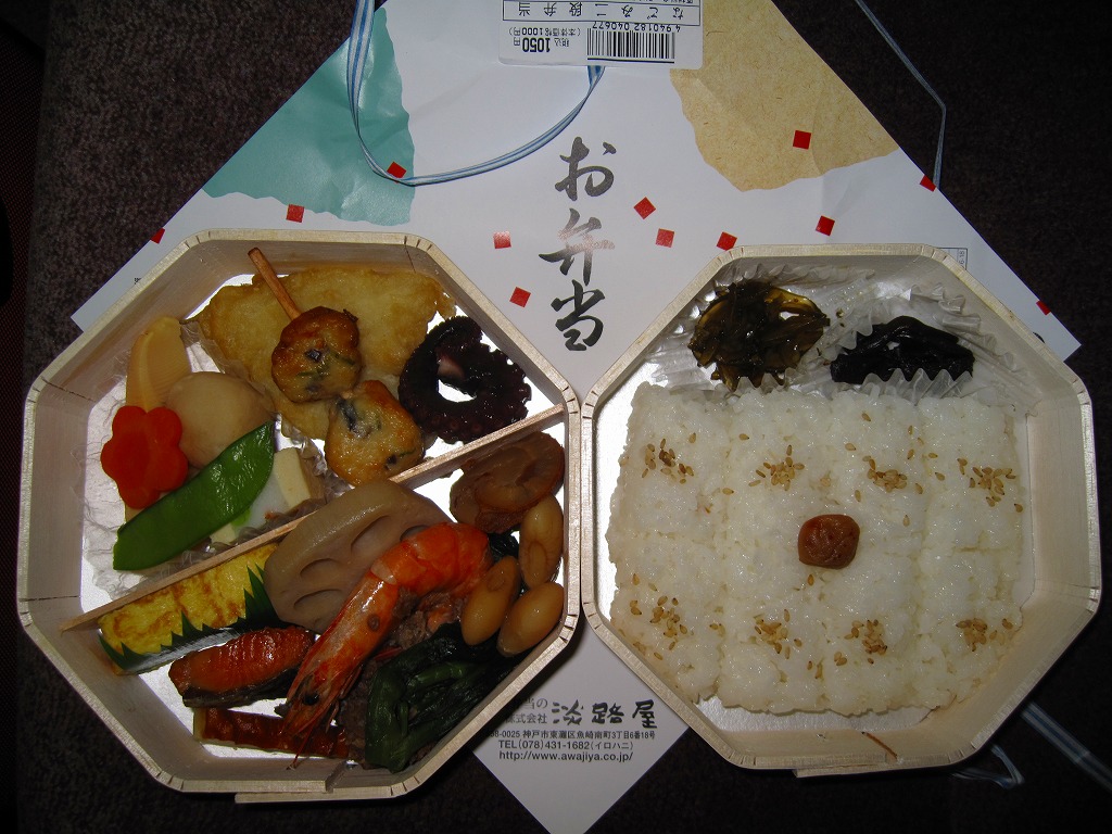 山陽新幹線の車内で、幕の内弁当と案内されて購入した神戸駅弁。枠と仕切りに経木を使用した正方形の容器に、ふたと掛紙を兼ねたボール紙を載せてワイン色のひもでしばる。中身は幕の内なんてとんでもなく、イカナゴ釘煮を添えたいりこと菜の俵飯とタコ入りいなりずしの御飯に、鱧(はも)のフライ、鰆(さわら)の焼き魚、海老団子、タコ焼に蛸足にイイダコという具合に海産物の風味豊かな内容。ふたを開けるだけで香るタコの旨さと柔らかさが特に良かった。容器内の隙間も個々の食材の形の良さにより高級感を生み出す方向に働く。現在は販売されていない模様。