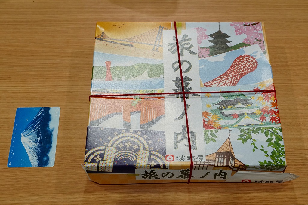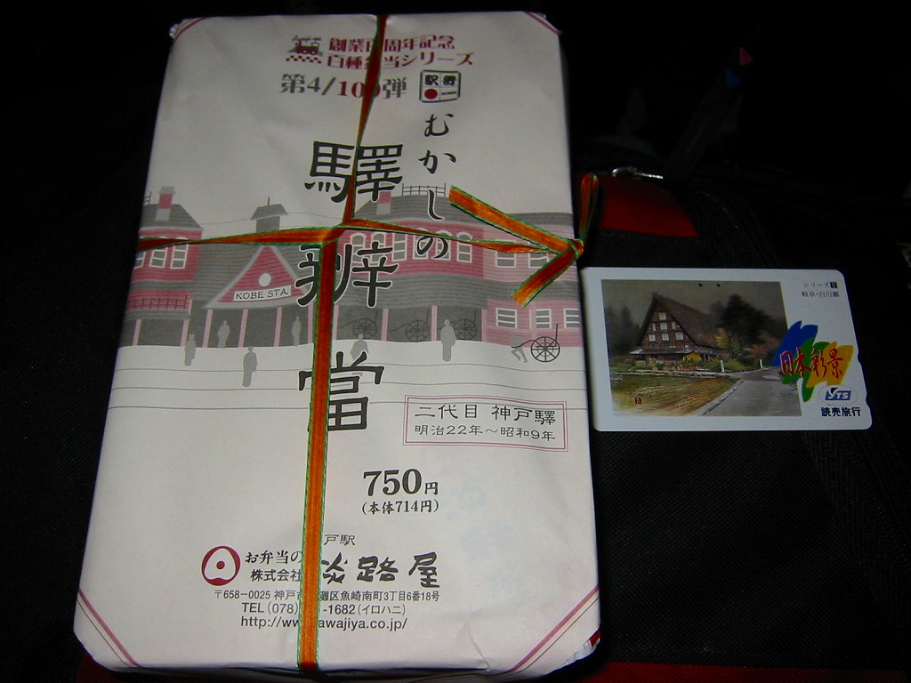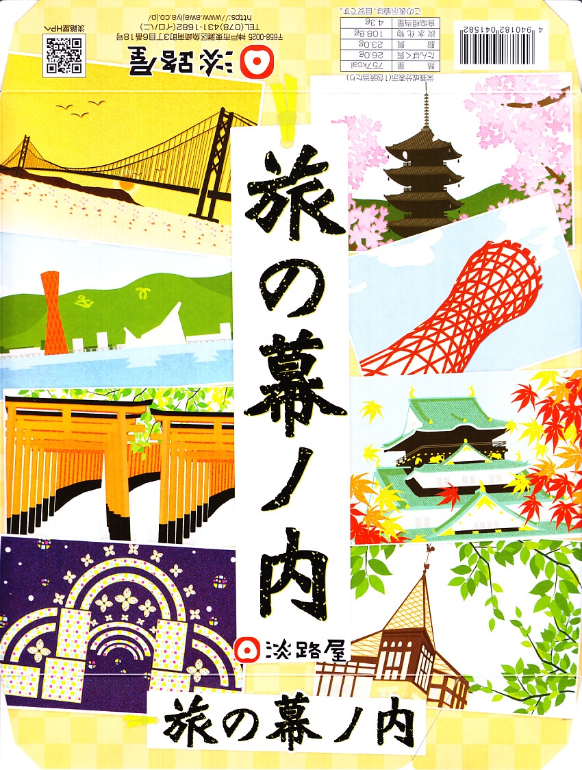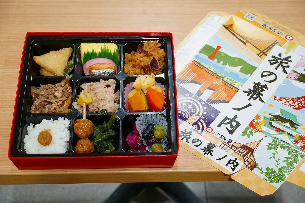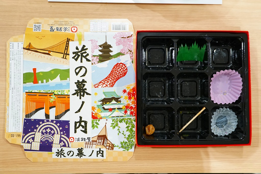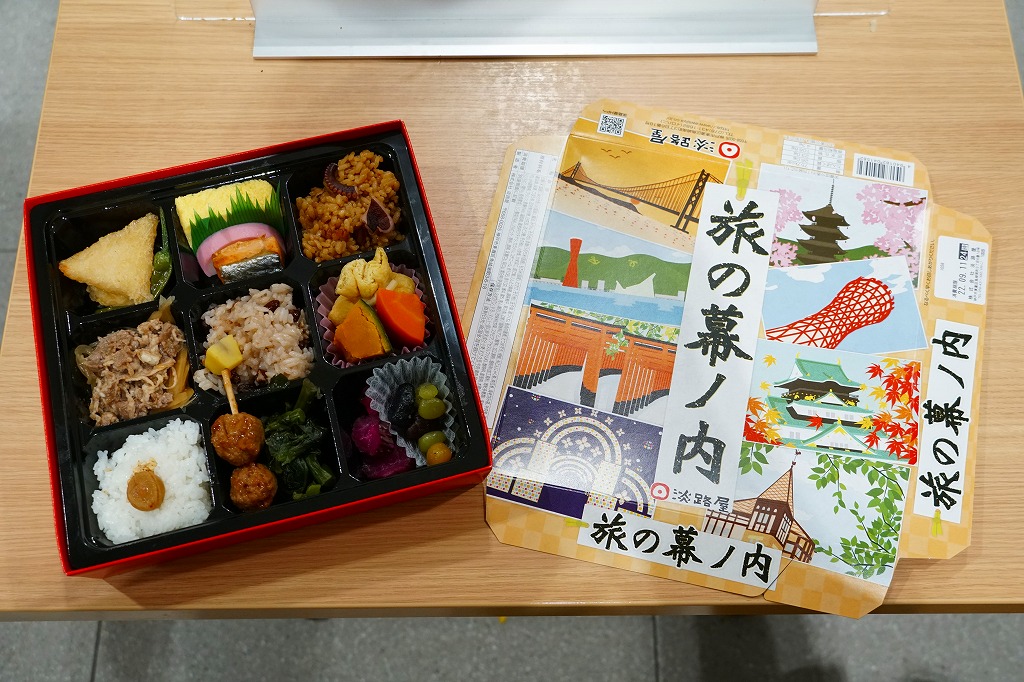 「旅の幕の内弁当」の名前で、2012年より前に発売か。調製元は神戸の駅弁屋だが、神戸エリアでなく主に大阪エリアで売られる弁当と考えられる。ふたには神戸に限らず京阪神エリアの名所が8点描かれる。正方形の9区画に収めた中身は、日の丸御飯、赤飯、たこ飯、牛肉煮、焼鮭とかまぼこと玉子焼、きんちゃくとかぼちゃとにんじんの煮物、鶏つくね串と菜の花、海老の包み揚げとサツマイモ天、煮豆としば漬け。内容の4割くらいが幕の内弁当という、車中食に向いたなんでもまるごと弁当。