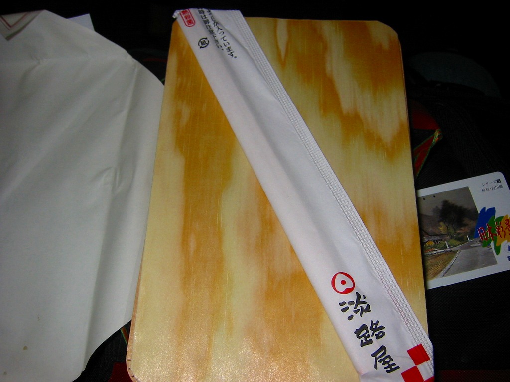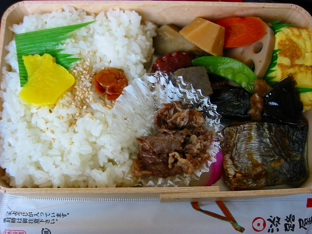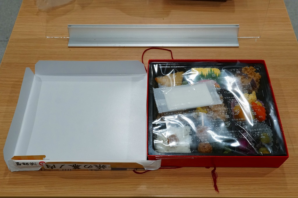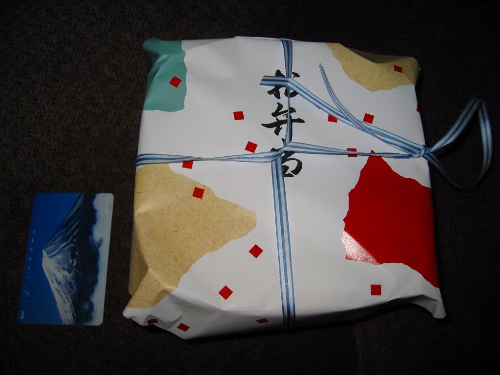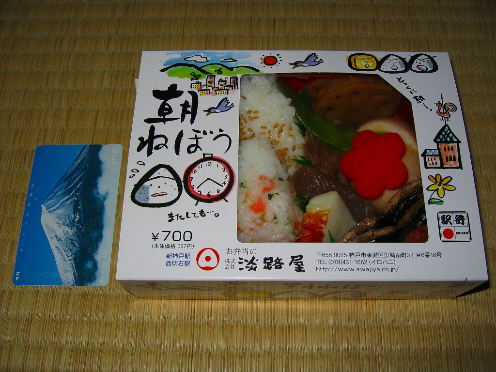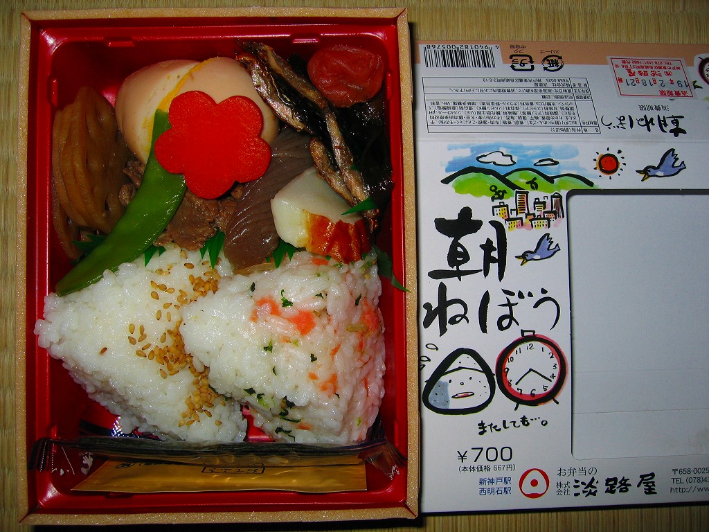 2007(平成19)年1月12日に発売か。長方形の容器に透明なふたをして窓開きのボール紙枠にはめるという、この駅弁屋の空弁で見たような大きさと構造の、中身が見える容器を使う。中身は鮭ちりめんおにぎりと胡麻振りおにぎり、蒲鉾と干サンマと牛肉煮に、煮玉子と煮物数点に梅干しなどで、つまり小さな和朝食。