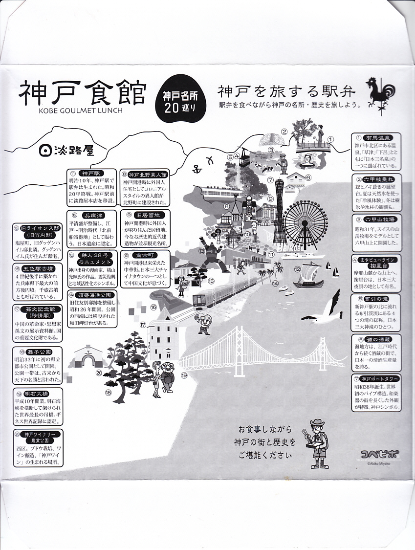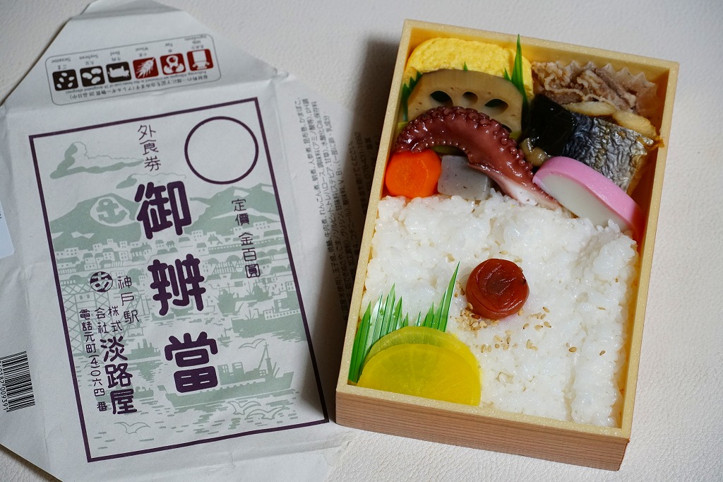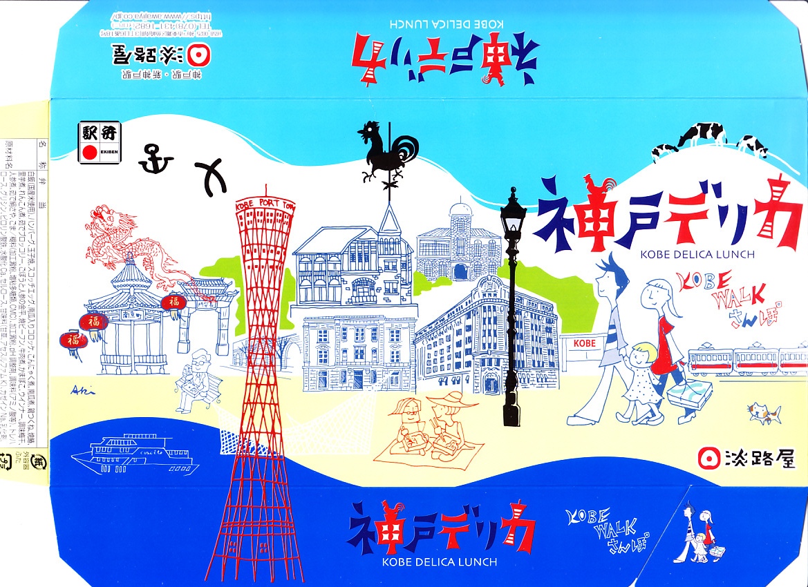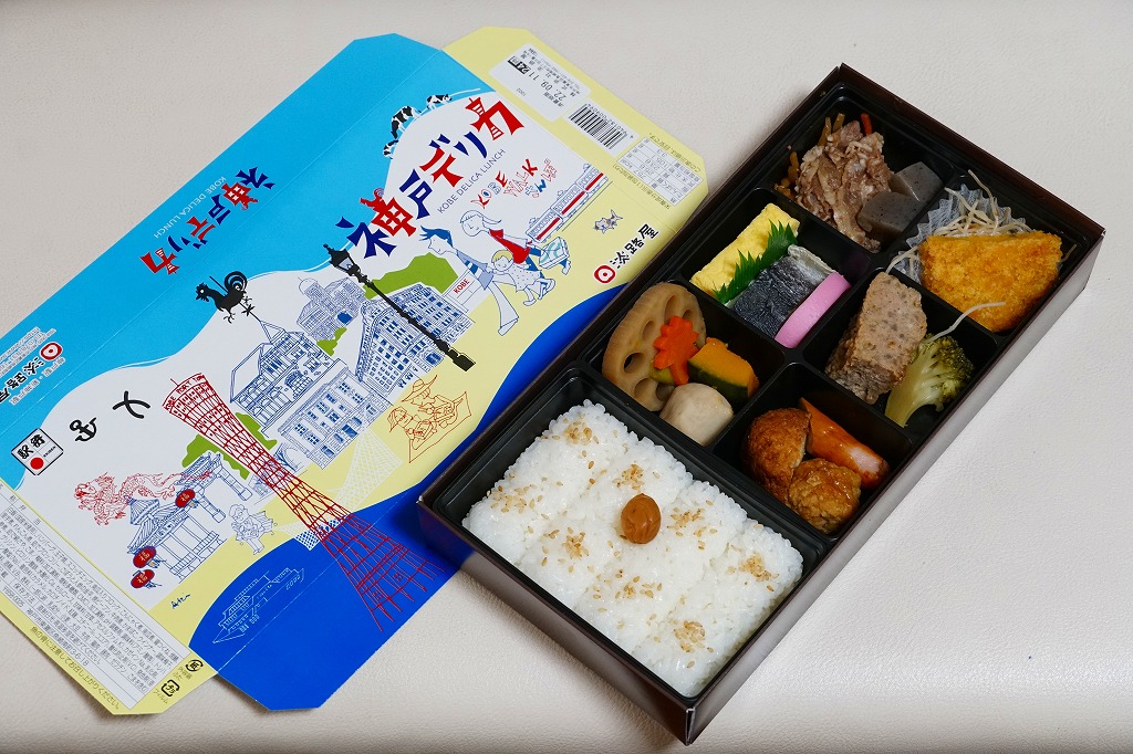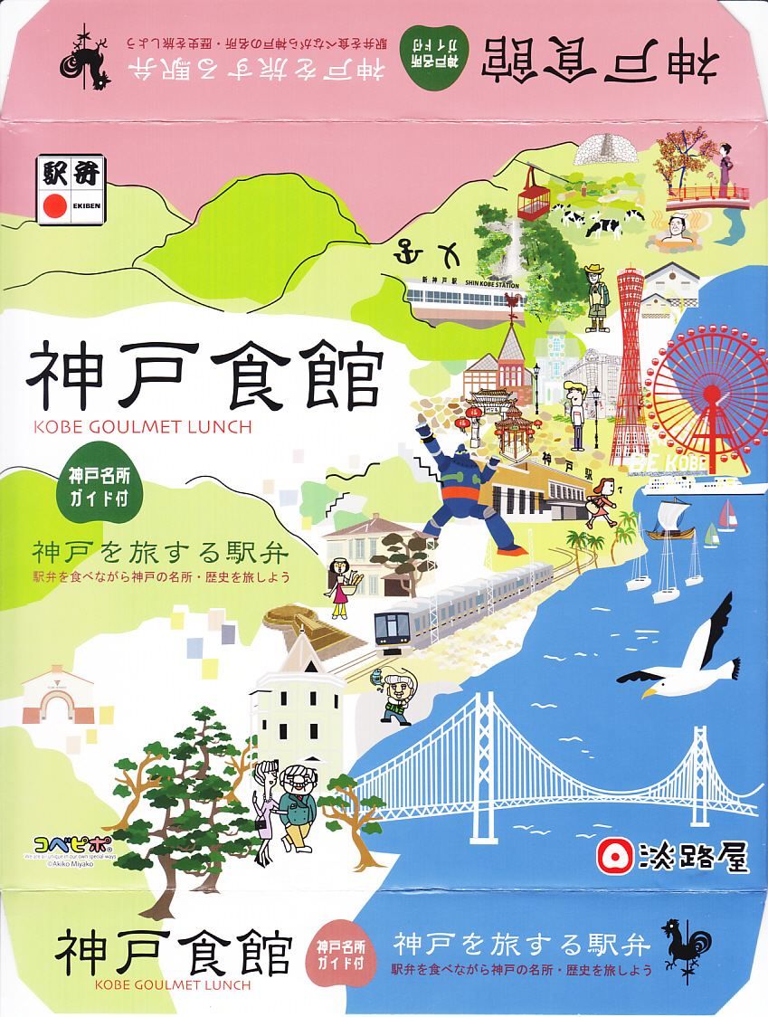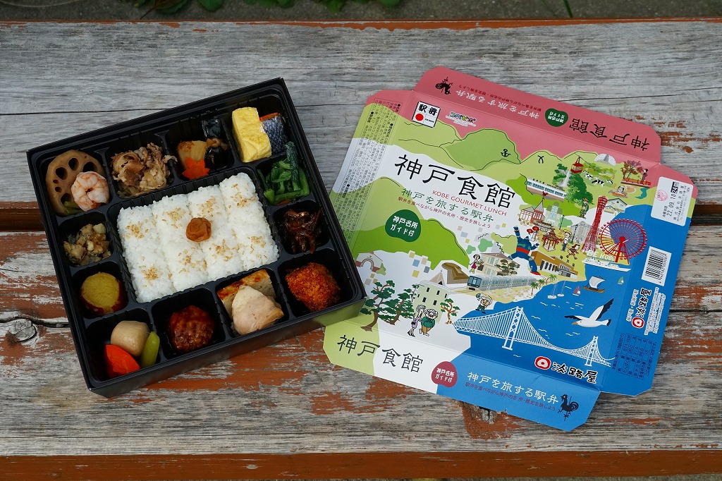 1990年代の発売か。正方形の容器にかかるふたには神戸の名所が描かれ、2021(令和3)年11月からは「神戸名所20巡り」として20種類ものイラストを描き、そのすべてに解説が付いて分かりやすくなった。中身は和洋の幕の内弁当タイプで、中央に日の丸俵飯を据え、その周囲の12区画に玉子焼と焼鮭、昆布巻などの煮物、牛肉煮、海老煮とレンコン煮、刻みアナゴ、さつまいも、サトイモなどの煮物、鶏つくね、鶏肉煮、タコ天、いかなごくぎ煮、小松菜おひたしなどのおかずを配置。おかずが豊富で、ワインよりビールか日本酒が合いそう。価格は2005年時点で1,100円、2014年4月の消費税率改定で1,130円、2022年3月から1,150円。