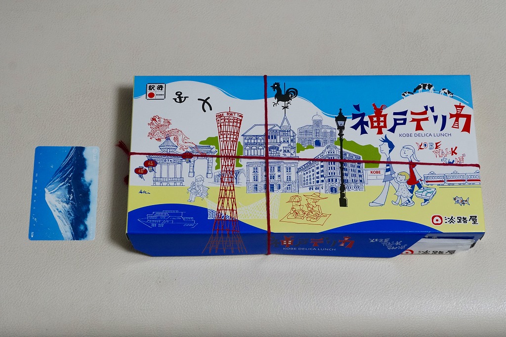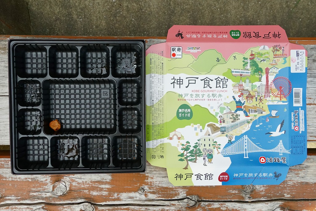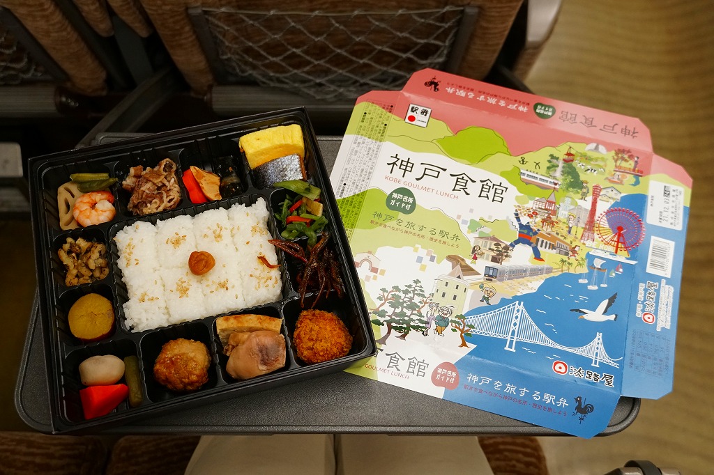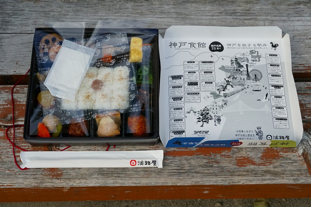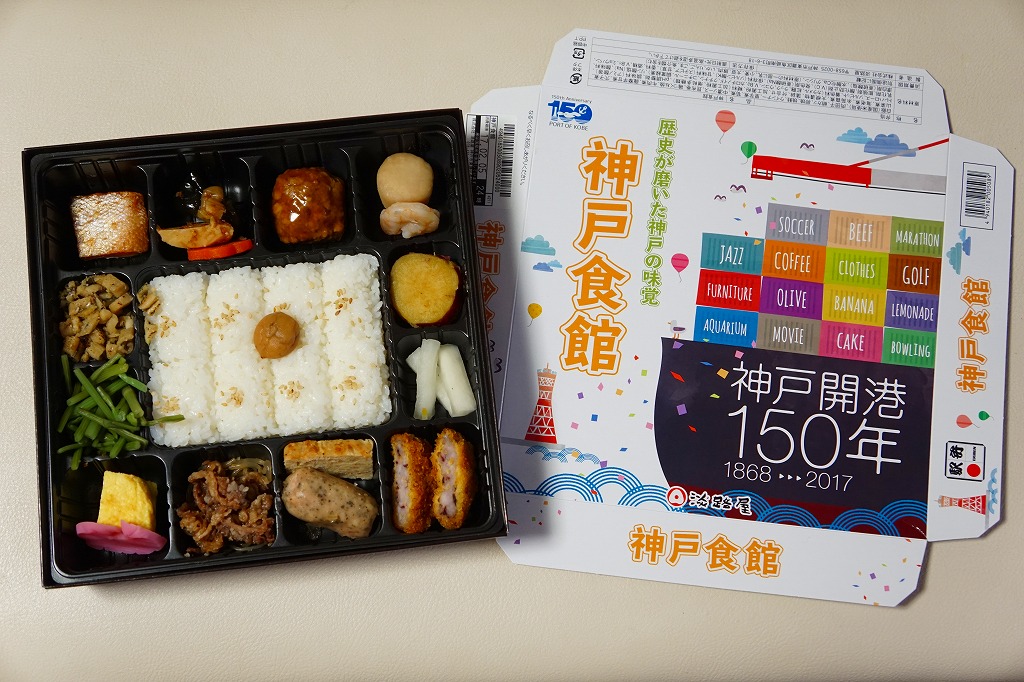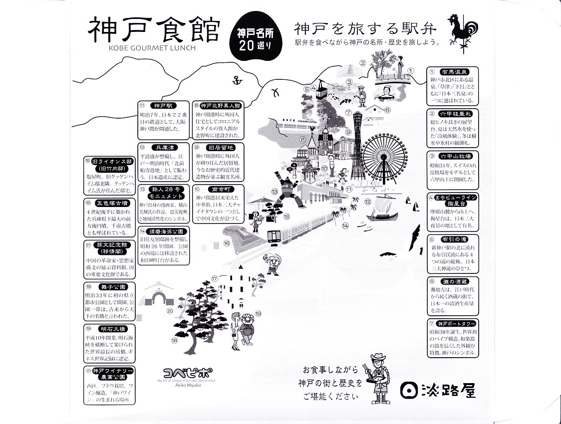 1990年代の発売か。正方形の容器にかかるふたには神戸の名所が描かれ、2021(令和3)年11月からは「神戸名所20巡り」として20種類ものイラストを描き、そのすべてに解説が付いて分かりやすくなった。中身は和洋の幕の内弁当タイプで、中央に日の丸俵飯を据え、その周囲の12区画に玉子焼と焼鮭、昆布巻などの煮物、牛肉煮、海老煮とレンコン煮、刻みアナゴ、さつまいも、サトイモなどの煮物、鶏つくね、鶏肉煮、タコ天、いかなごくぎ煮、小松菜おひたしなどのおかずを配置。おかずが豊富で、ワインよりビールか日本酒が合いそう。価格は2005年時点で1,100円、2014年4月の消費税率改定で1,130円、2022年3月から1,150円。