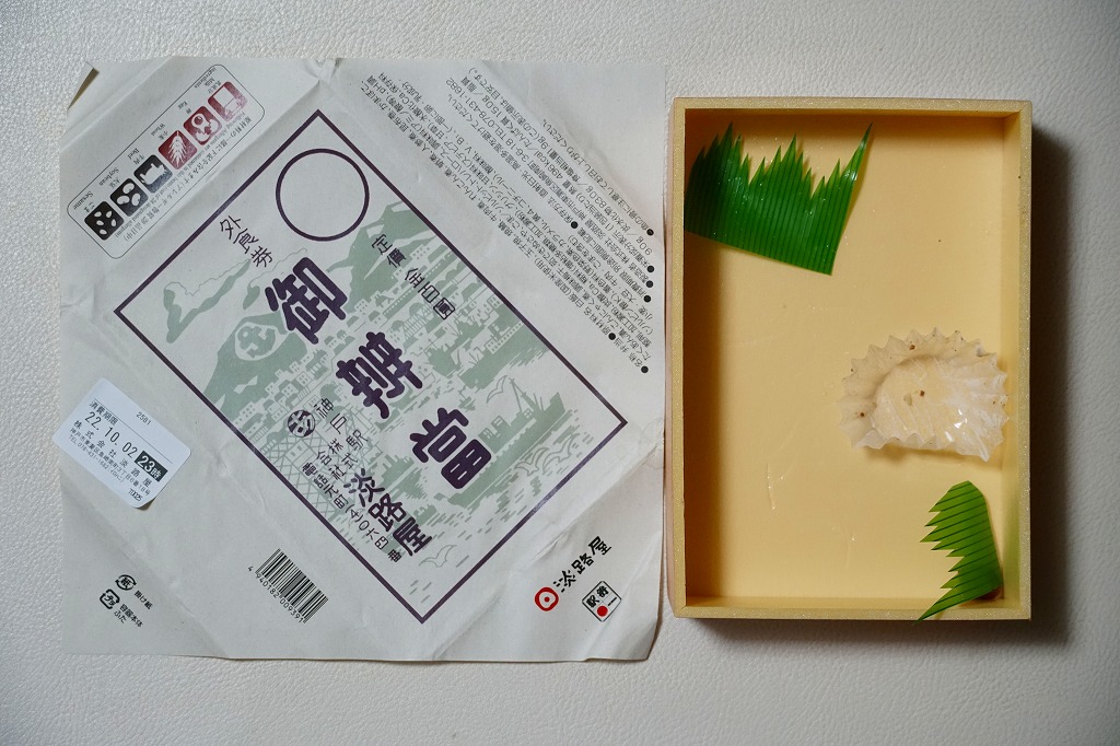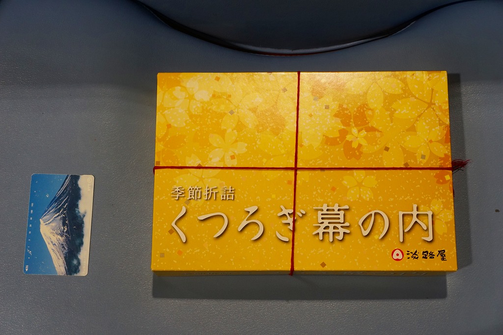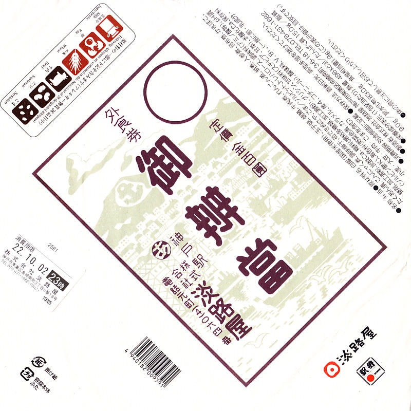 2022(令和4)年10月1日から31日まで、新神戸駅や西明石駅など関西各地と東京駅で販売。駅弁の名前は「むかしの駅辨當」とも。日本鉄道構内営業中央会の鉄道開業150年記念復刻駅弁企画により、同月から期間限定で販売された31社34駅弁のひとつ。昔懐かしの掛け紙を用いた幕の内弁当ということで、外食券の文字と百円の定価表示から、1950年代前半、昭和20年代後半のものと思われる駅弁掛紙の絵柄を取り入れたのだろう。