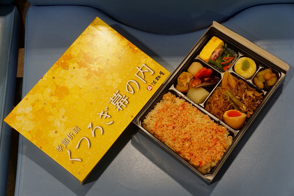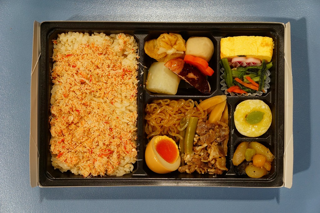 詳細不詳。新神戸駅弁の淡路屋が、駅弁と見なさないが駅弁売店でも売る季節弁当ではないかと想像する。仕出し弁当向けにも見える、ボール紙箱にプラ製トレーを入れた折り箱に、カニ飯、牛すき焼きと煮玉子、タコやダイコンなどの煮物、玉子焼と小松菜おひたし、五色豆煮、餡入り餅などを詰める。そんな内容はまったく幕の内弁当でなく、御飯もおかずも内容どおりの美味。駅弁であれば、他の駅弁屋であれば、気の利いた名前を付けて売るのではないかと思う。