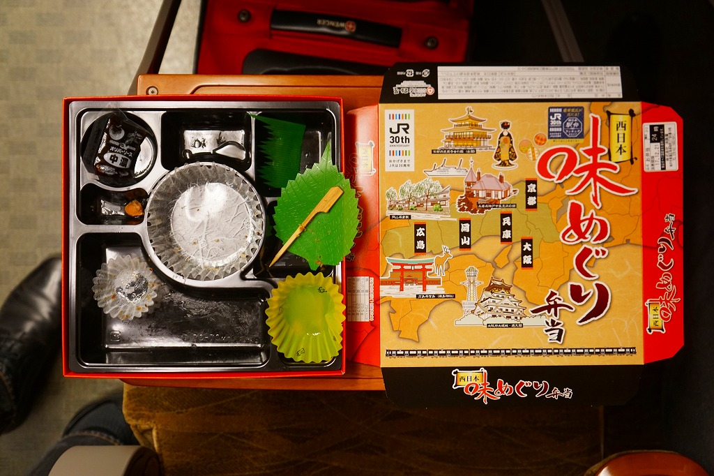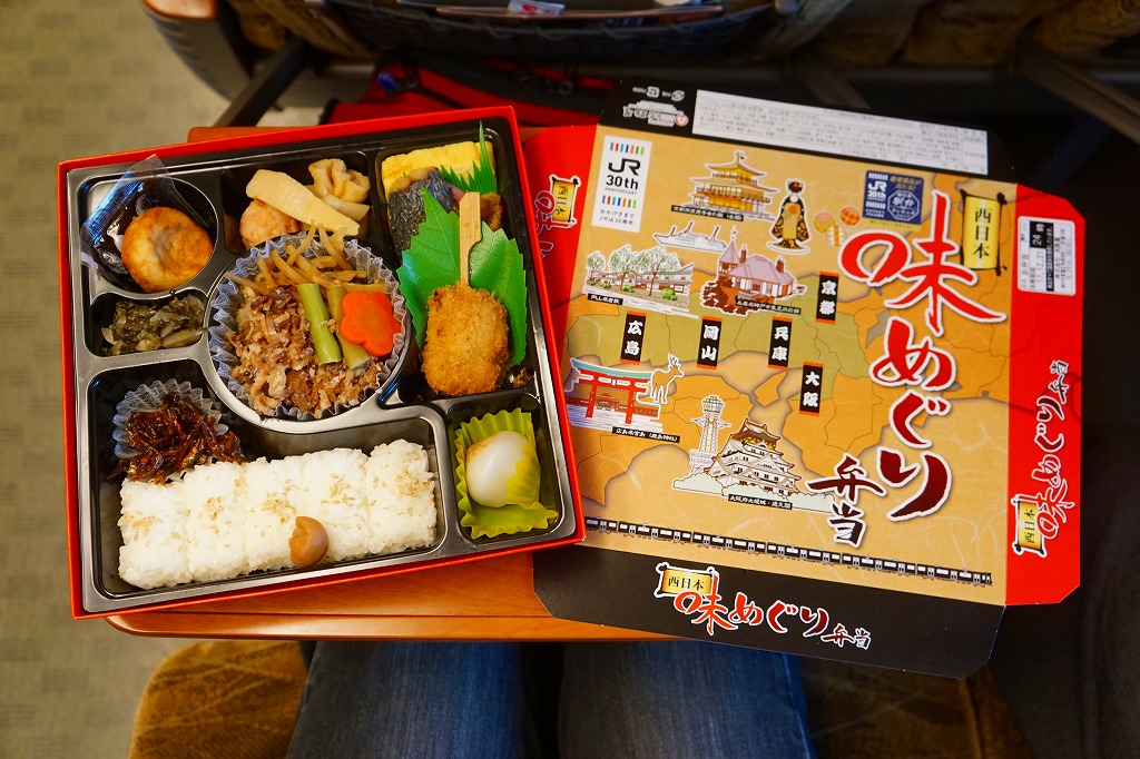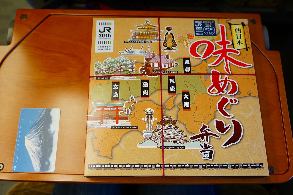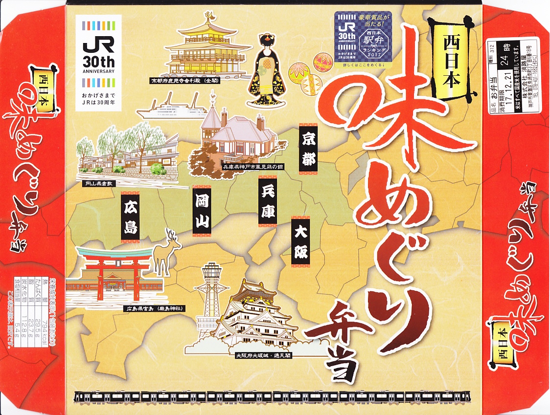2017(平成29)年10月14日の発売は、JR発足30周年記念駅弁であり、JR西日本のJR発足30周年記念企画「西日本駅弁ランキング」の開催に合わせたもの。平たく広い正方形の容器に、型押し日の丸俵飯、たこやき、串カツ、牛肉煮、焼サバ、玉子焼、たこボールなどの煮物、いかなごくぎ煮などを詰める、幕の内弁当の変わり種。ただ、「西日本」といいながらパッケージの地名は京都・大阪・兵庫・岡山・広島しかなく、その5地点5種で「味めぐり」とまで主張できるかどうか。2019年頃までの販売か。