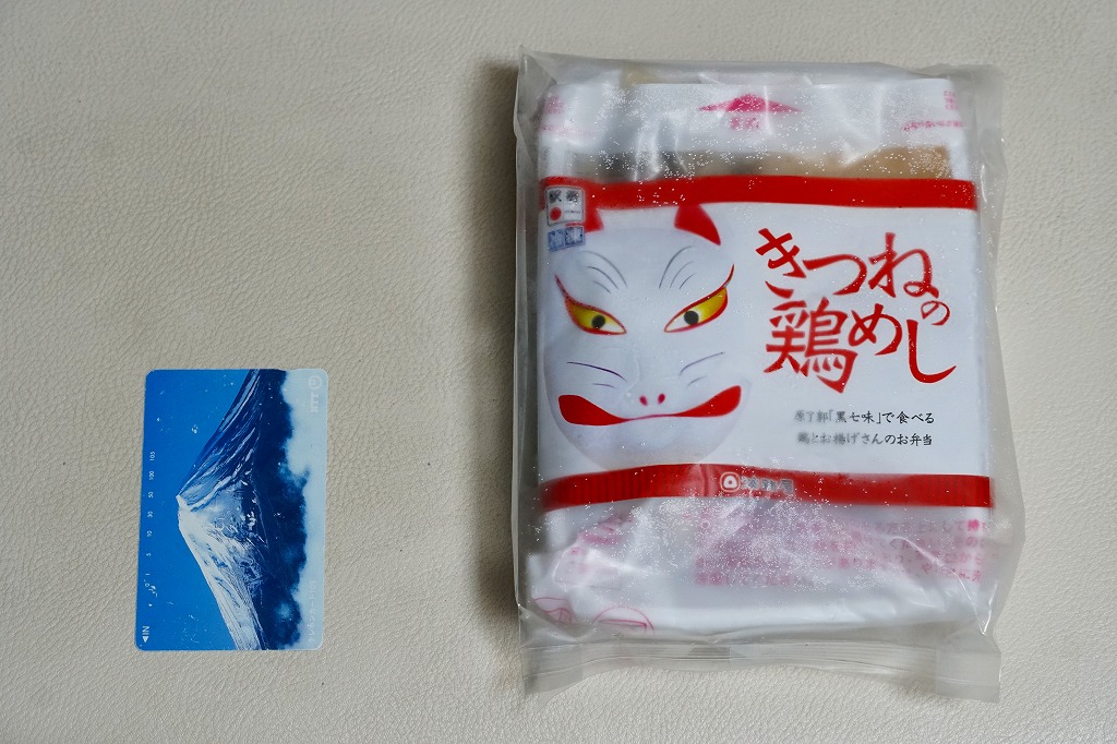 上記の駅弁「きつねの鶏めし」の、2017(平成29)年時点での姿。上記の2025年のものと比べて、掛紙での記載事項が増えた以外、変わらない。当時は通年で同じものが売られた。