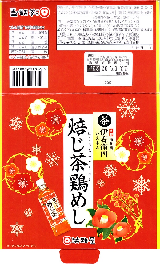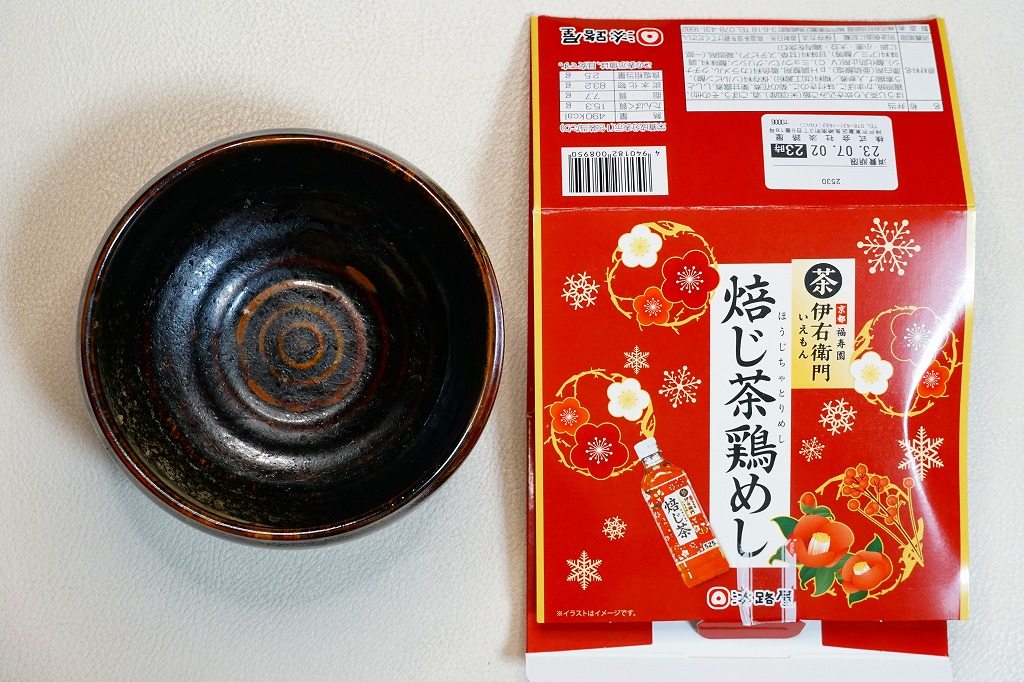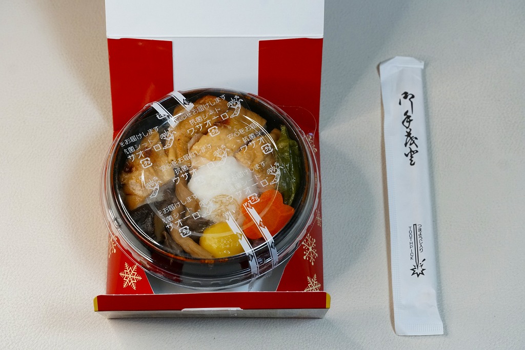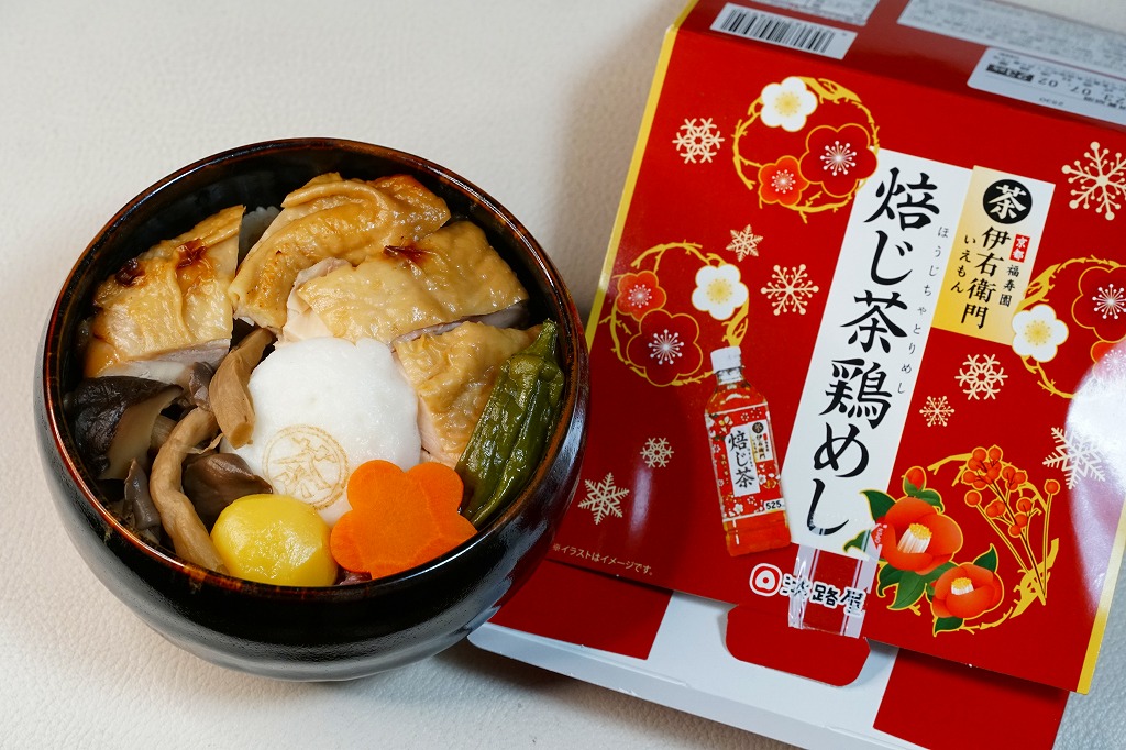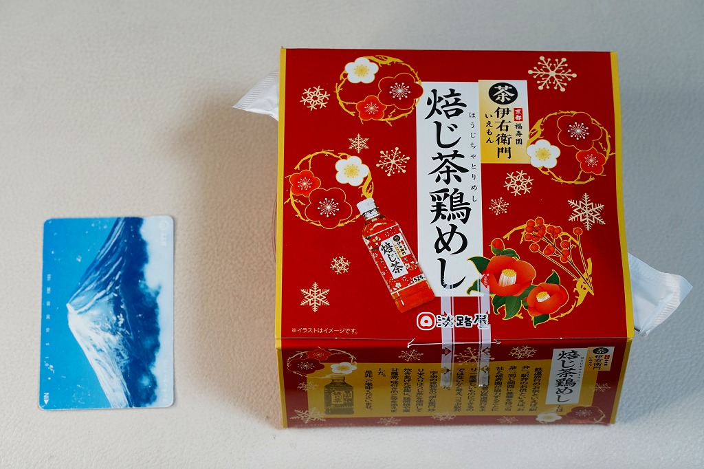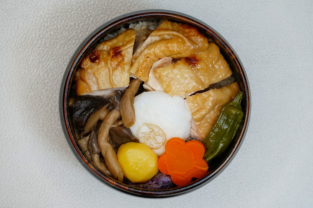 秋冬の駅弁大会シーズンに向けた、2022(令和4)年秋の新商品か。京都をイメージした国産茶器を、赤い紙箱に収める。中身は宇治の露製茶の「伊右衛門炒り米炒りほうじ茶」で炊いた、ほうじ茶炒り炊き込み御飯を、鶏照焼、白いかまぼこ、きのこ、菊花、栗甘露煮、ししとう、ニンジンで、覆ったり彩ったもの。「京都福寿園 伊右衛門」とのタイアップなのだろうか、その名とペットボトル茶のイラストが紙箱に記される。器と淡い味や香りで上質な印象を受ける鶏飯。これは2023年7月に公式サイトの通信販売で購入したが、実際には2023年には売られなくなったらしい。
