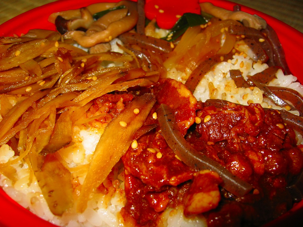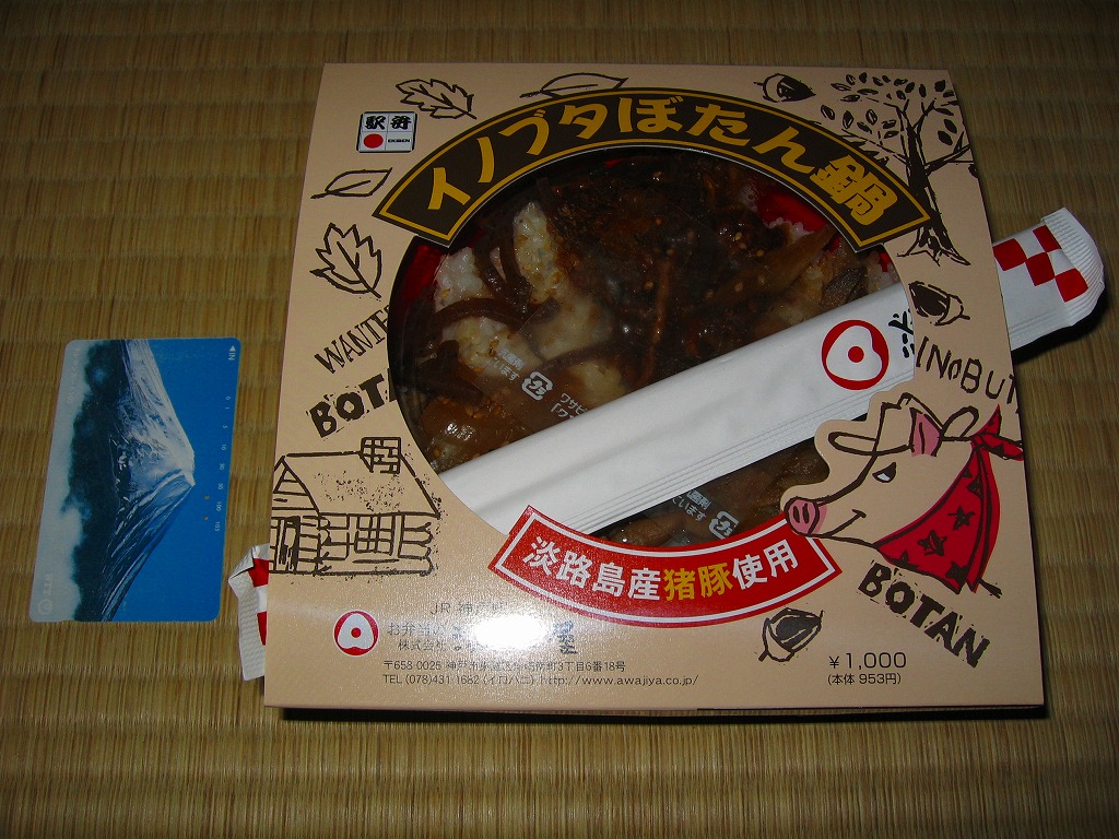 イノシシ年な2007(平成19)年の、1月12日に発売か。ふたが透明な円形のプラ製の惣菜容器を、なんとなくウェスタン風に商品名や景色等を描くボール紙の枠にはめる。中身は白御飯の上に淡路島産のイノブタを味噌煮でちょっぴり載せて、ごぼう、タマネギ、こんにゃく、しめじなどを添える。
