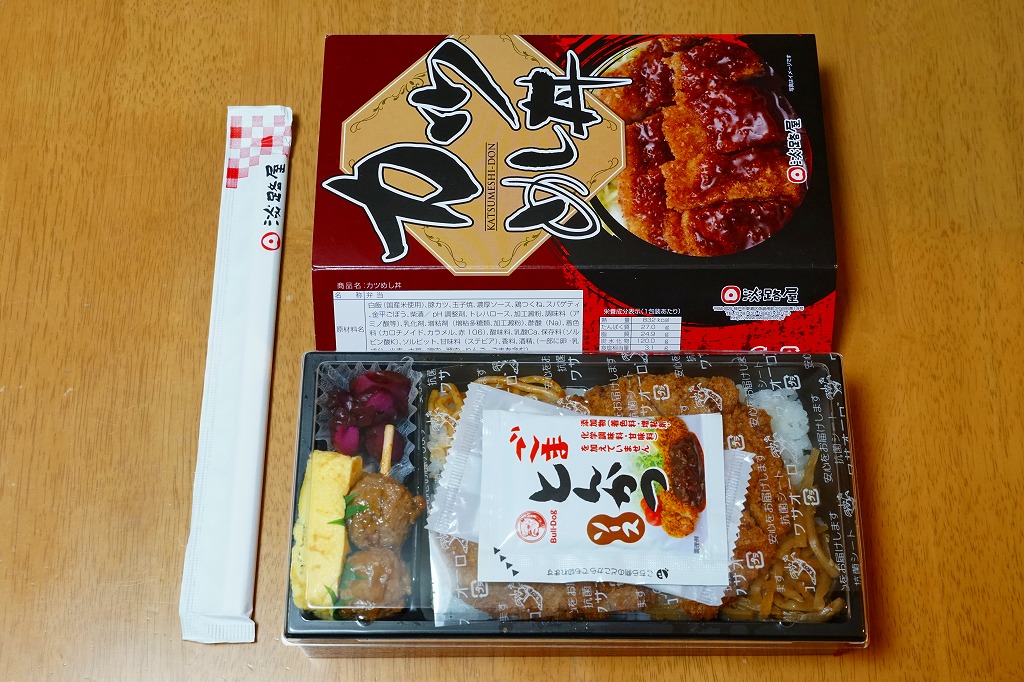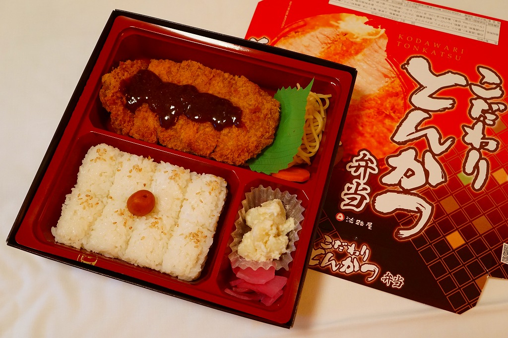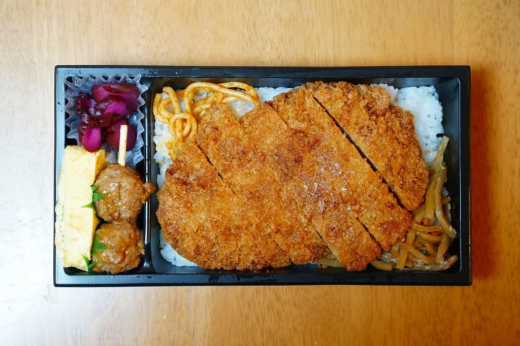 2018(平成30)年の発売か。ふたが透明な長方形のプラ容器に、白飯を詰め、薄くて平たいトンカツで覆い、きんぴらとスパゲティも載せ、玉子焼と鶏つくね串と柴漬けを添える。シンプルで、ガツガツ食べ進む内容。神戸に限らず、あるいは神戸の駅弁売店でなく、関西エリアで手広く売られる商品である模様。価格は2018年時点で650円、2020年の購入時で750円、2022年時点で780円。2023年頃までの販売か。