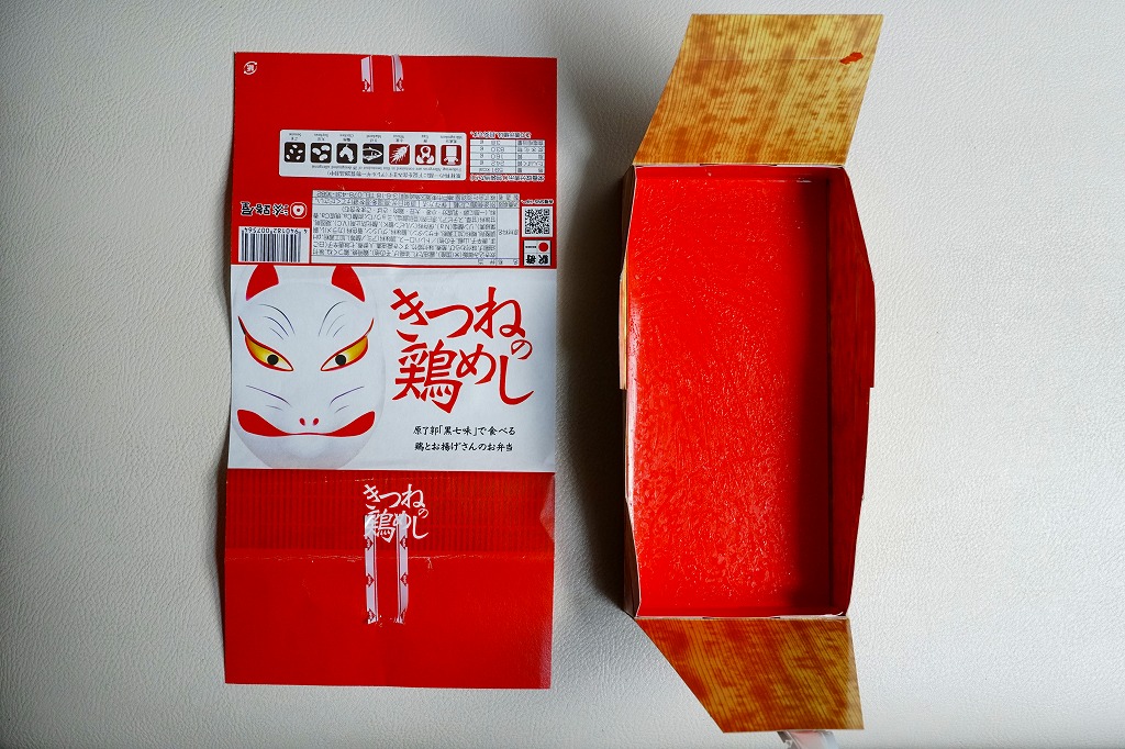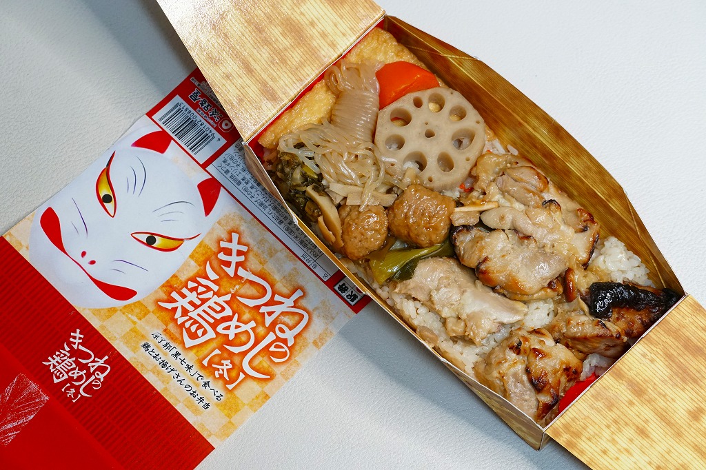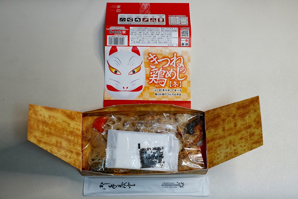 電子レンジ対応の白いプラ製トレーに、油揚げの炊込飯を詰め、鶏照焼、油揚げ、鶏つくね、わらび、姫竹、すぐき、ネギ、ニンジンを散らし、空気を抜いてプラ袋に密封し、駅弁マークのある掛紙を巻く。中身も掛紙の絵柄も、上記の駅弁「きつねの鶏めし」と同じ。加熱でアツアツでも常温でも、駅弁と同じ味がした。駅で買って道中で食べることはできないが、おいしい非常食として優れるほか、出掛けられない人に旅気分を味わってもらうアイテムにできるかもしれない。賞味期限は製造後約3か月か。