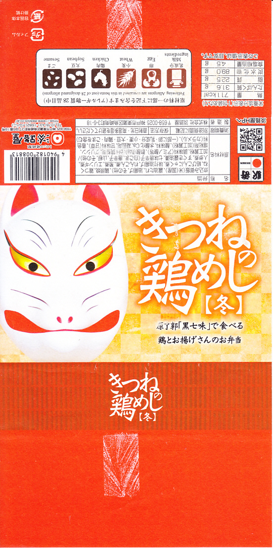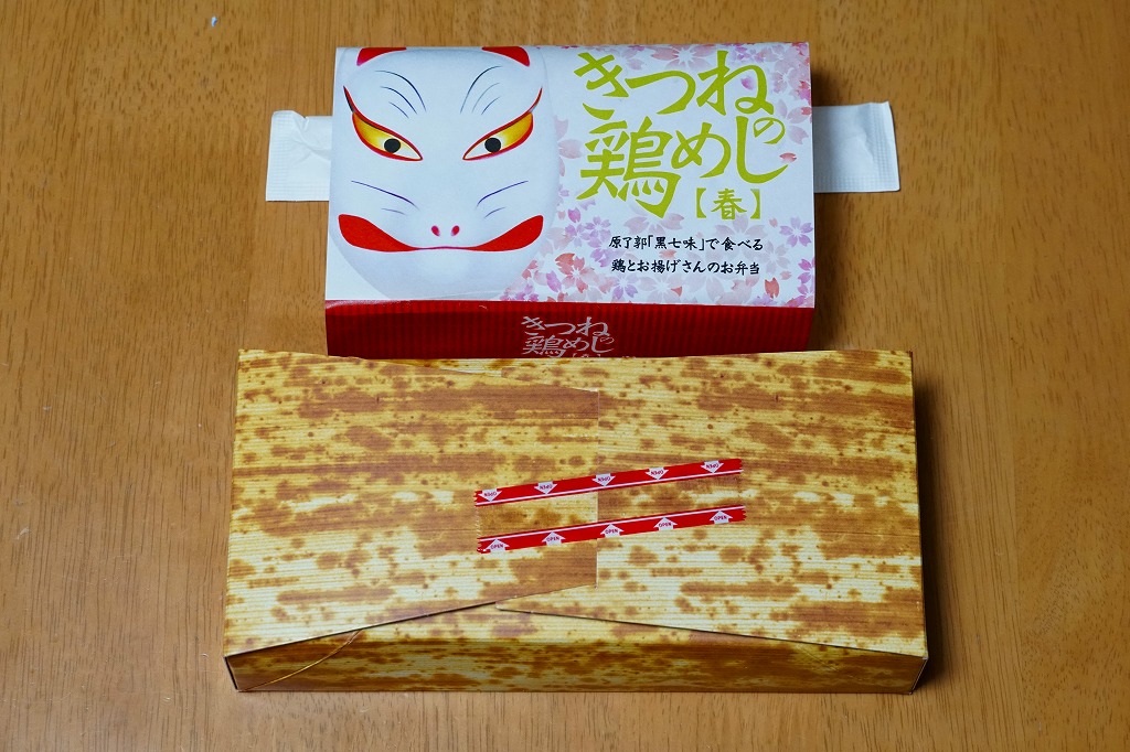 2020(令和2)年の12月に発売。人気の新神戸駅弁「きつねの鶏めし」について、2020(令和2)年9月に初めて季節の商品「秋」を発売、続いて春が来た。竹皮柄のボール紙製容器にキツネ顔の掛紙を巻くのは、従前の「きつねの鶏めし」と同じ。掛紙の背景で油揚げの市松模様が暖かい。