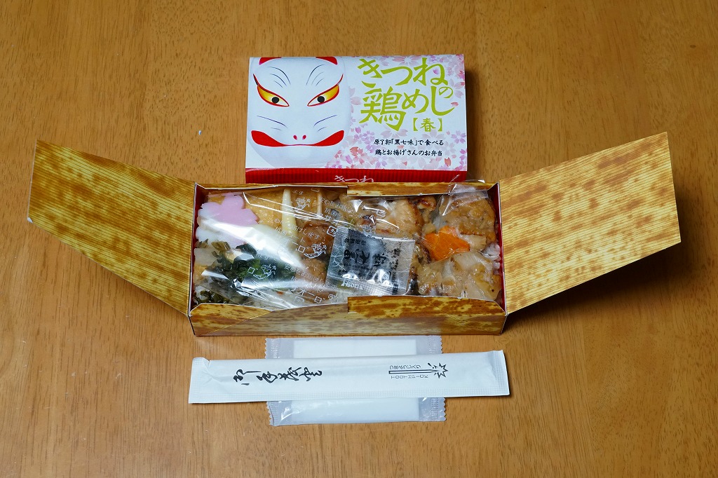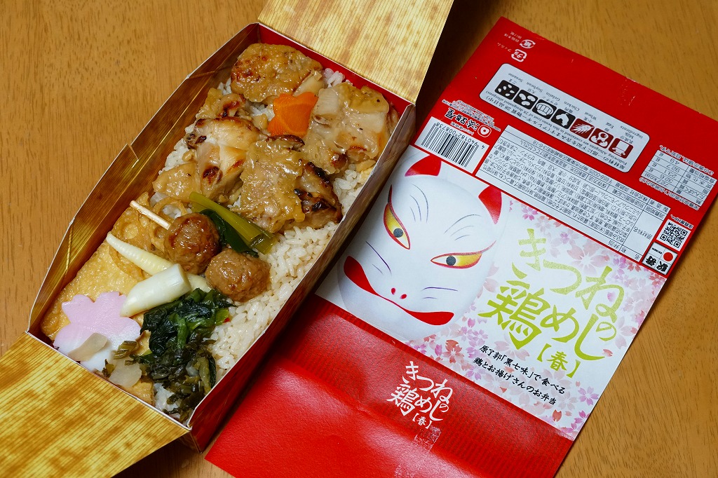 油揚げの炊込飯を詰め、鶏照焼、油揚げ、鶏つくね、すぐき、ネギ、レンコン素揚げ、ニンジンを散らし、かまぼこと菜の花を詰め、原了郭の黒七味を添付する内容も、従前とほぼ同じ。季節で中身を変えたはずが、その違いにはほぼ気が付かない、油揚げ風味の鶏飯。価格は2021年の発売時で850円、2023年時点で920円、2024年時点で980円、2025年時点で1,050円。
