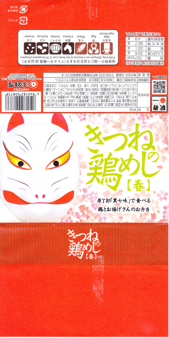 2021(令和3)年の2月に発売。人気の新神戸駅弁「きつねの鶏めし」について、2020(令和2)年9月に初めて季節の商品「秋」を発売、12月に「冬」になり、年が明けて春が来た。竹皮柄のボール紙製容器にキツネ顔の掛紙を巻くのは、従前の「きつねの鶏めし」と同じ。掛紙の背景に桜の花びらが散る。