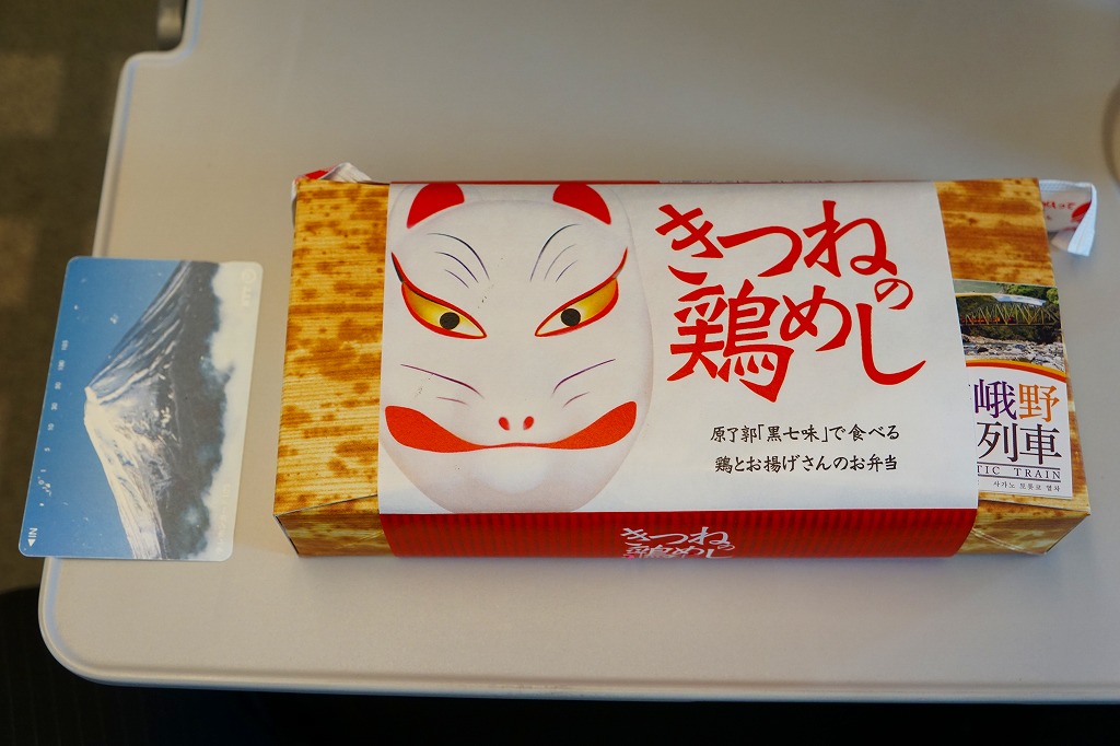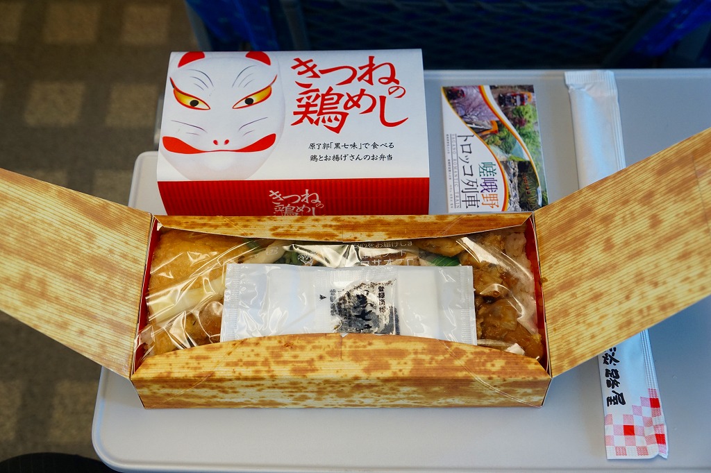 2016(平成28)年7月2日の発売。調製元と嵯峨野トロッコ列車とのコラボで京都をイメージした駅弁とのことで、神戸エリアに加えて嵯峨野観光鉄道トロッコ嵯峨駅でも売り出したそうな。竹皮柄のボール紙箱に油揚げの炊込飯を詰め、鶏照焼、油揚げ、鶏つくね、わらび、姫竹、すぐき、ネギ、ニンジンを散らし、原了郭の黒七味を添付する。観光列車の旅を彩るというよりもむしろ、飾らなくとも旅の飯になりうる新幹線駅向け鶏飯駅弁ではないかと思った。