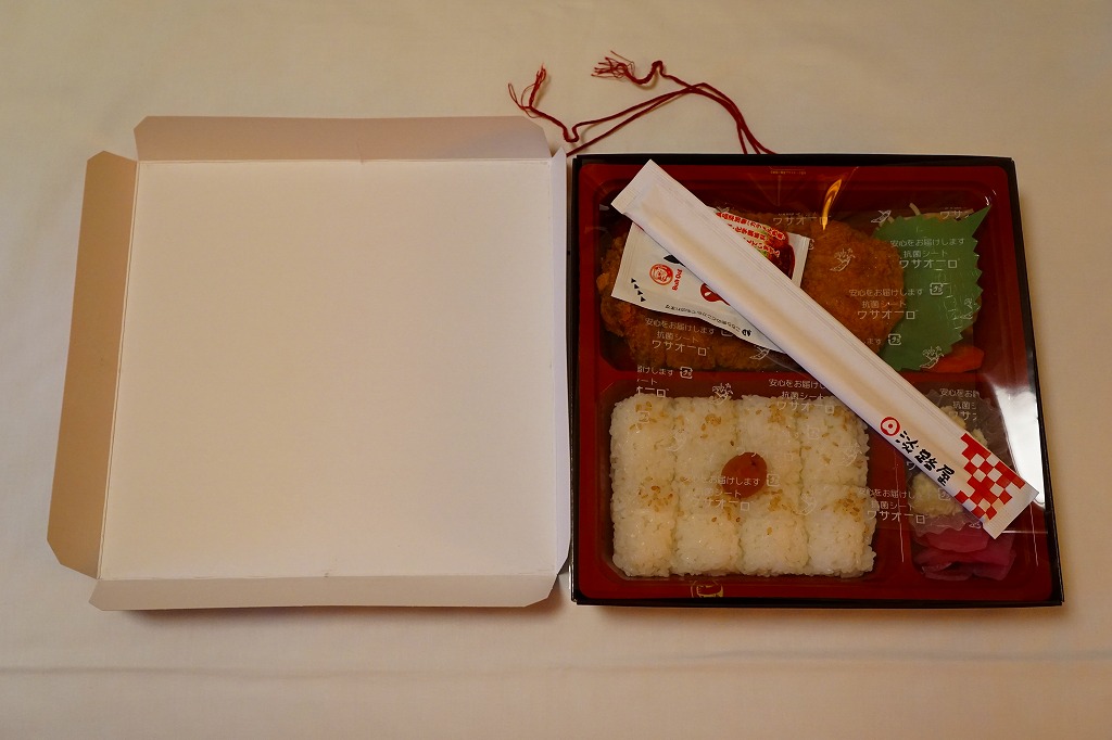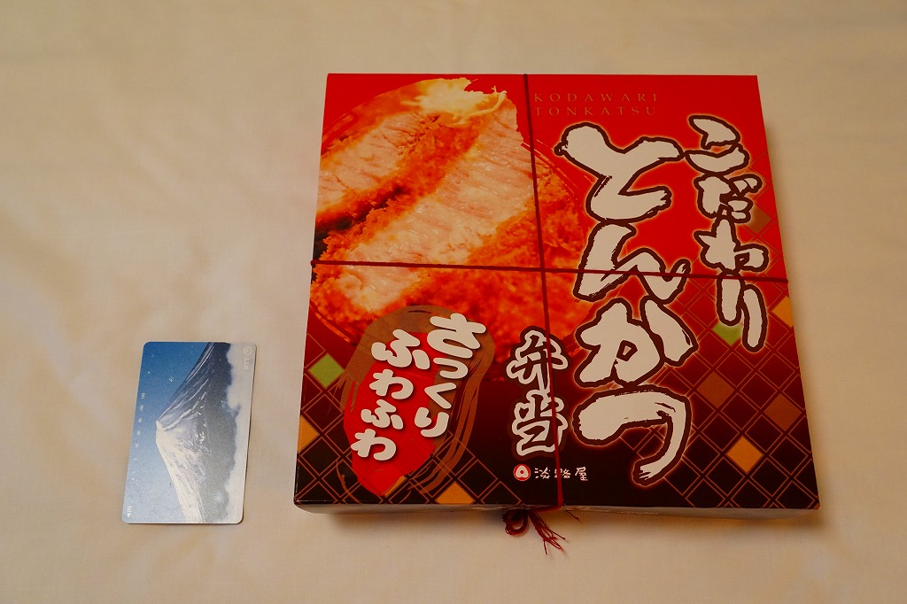 この名前と内容では2014(平成26)年のみの販売か。日の丸俵飯にトンカツ1枚、スパゲティ、ポテトサラダ、ニンジン煮、大根漬物という、見事に典型的なとんかつ弁当。このデパ地下商品を駅で売るかは分からないが、見た目は駅弁で、定評ある駅弁屋の味なので、常温で締まる。