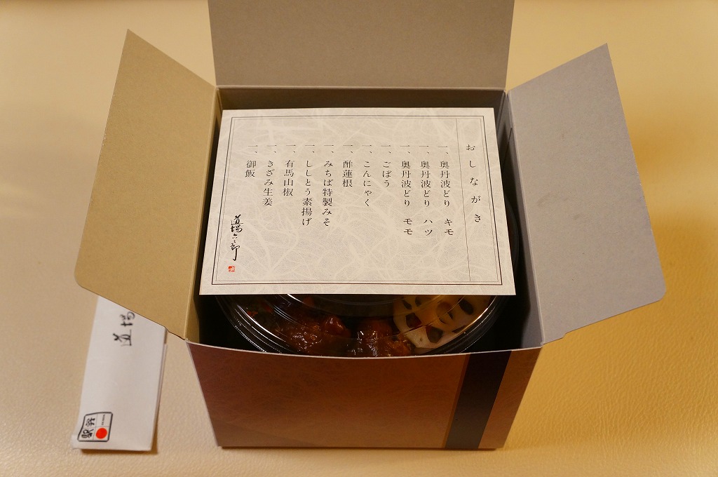 テレビやネットで「和の巨匠」と紹介される道場六三郎(みちばろくさぶろう)氏が監修したこの弁当の、百貨店のチラシによる公式な宣伝文は、「鶏のレバーやハツ、ごぼう、こんにゃくなどを秘伝の田楽みそで和えました。有馬山椒と刻み紅しょうがのアクセントが食欲をそそります。」。添付のおしながきに記される中身は、奥丹波どりキモ、奥丹波どりハツ、奥丹波どりモモ、ごぼう、こんにゃく、酢蓮根、みちば特製みそ、ししとう素揚げ、有馬山椒、きざみ生姜、御飯。