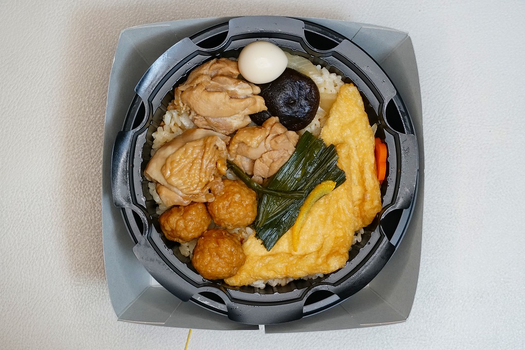 油揚げの炊込飯を詰め、鶏照焼、油揚げ、鶏つくね、すぐき、ネギ、レンコン素揚げ、ニンジンを散らし、コンニャクとエリンギを詰め、原了郭の黒七味を添付する内容も、従前とほぼ同じ。季節で中身を変えたはずが、その違いにはほぼ気が付かない、油揚げ風味の鶏飯。価格は2020年の発売時で850円、2023年時点で920円、2024年時点で950円、2025年時点で980円。