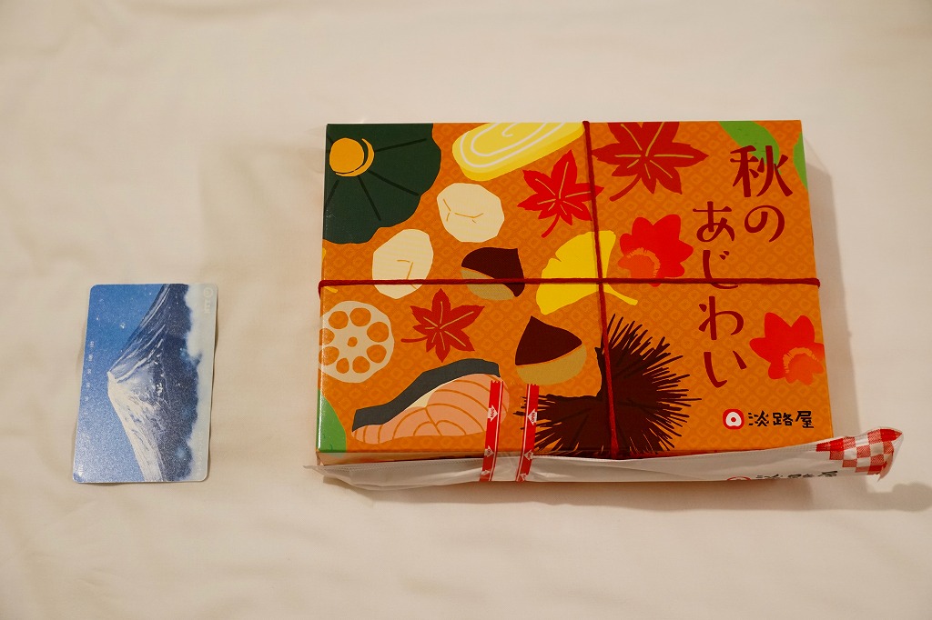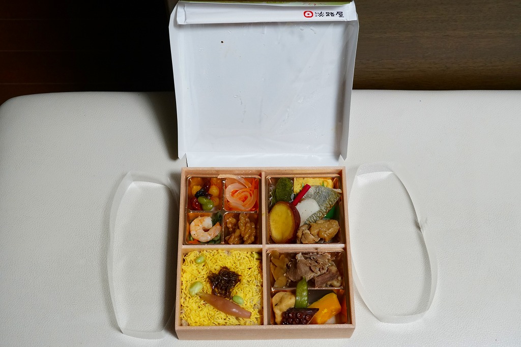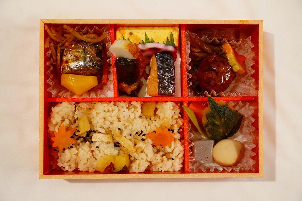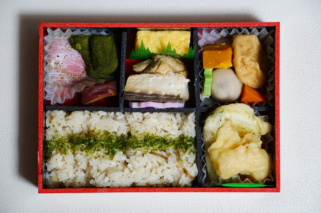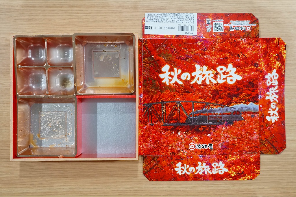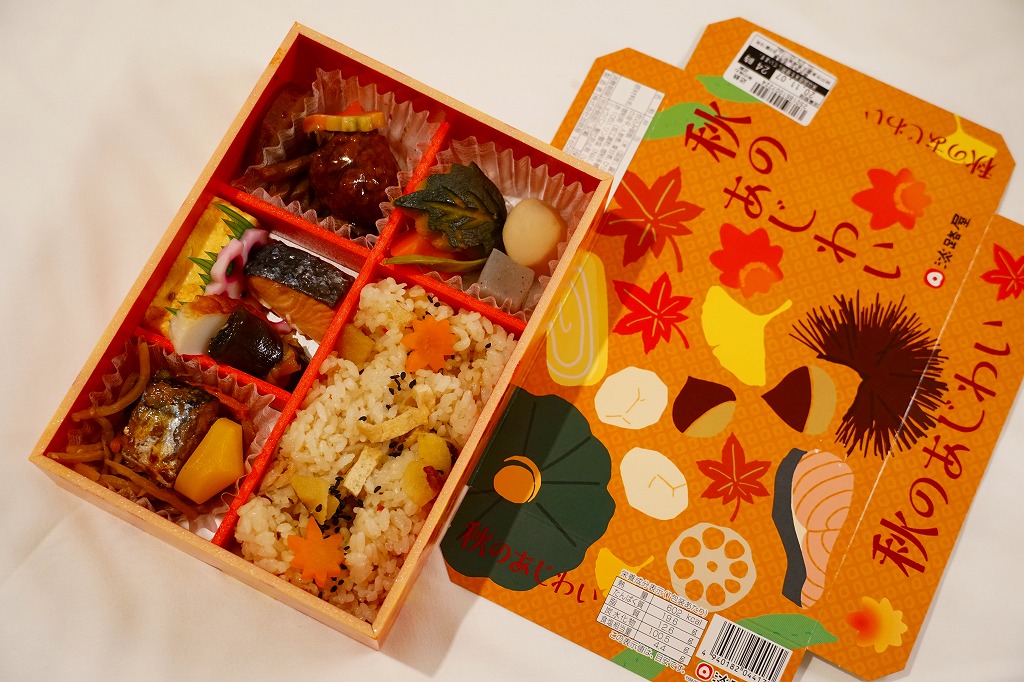 2014(平成26)年9月に「秋の味わい幕の内弁当」の名前で、京阪神エリアで発売か。おそらく9月から11月までの販売。中身は炊込飯にサツマイモ、煮物、肉団子、焼鮭と蒲鉾と玉子焼、サンマ山椒煮など。秋の色と味がコンパクトに詰まっていた。中身の見栄えもふたの絵柄も、秋らしい彩り。淡路屋には駅弁マークを付ける駅弁と、このそうでない弁当があり、しかし駅では両者を一緒に販売。何か区別があるのだろうか。価格は2014年時点で880円、2020年時点で900円、2022年秋には950円。
