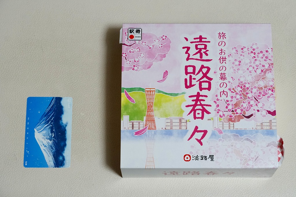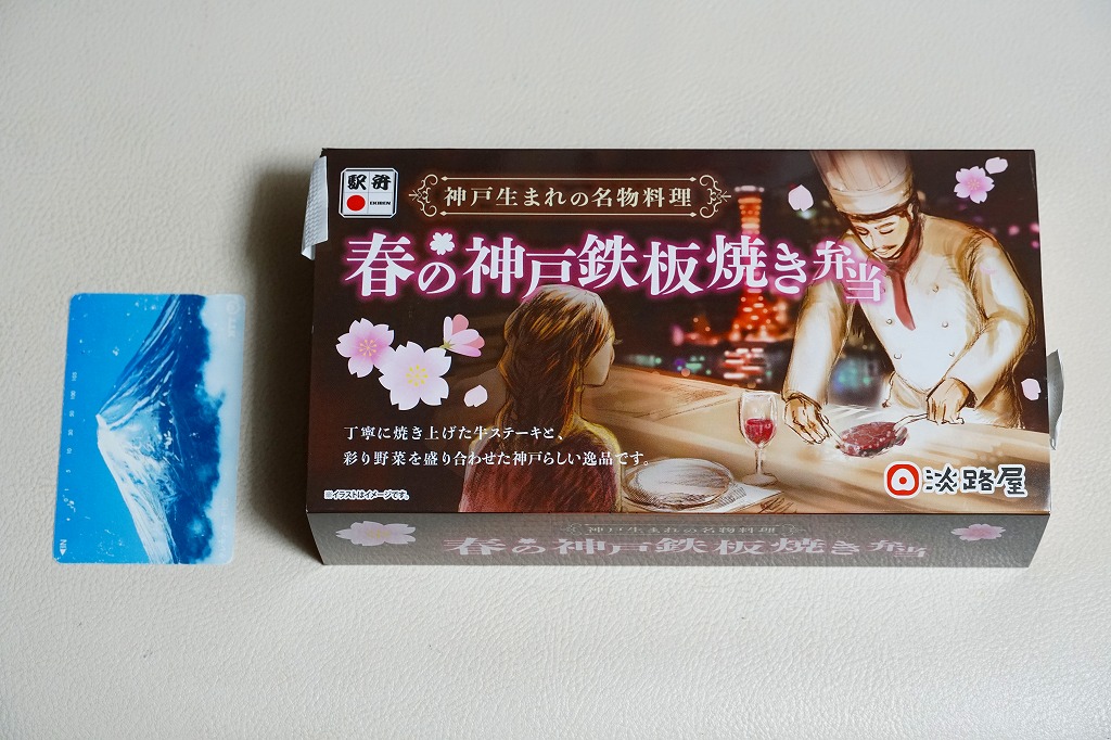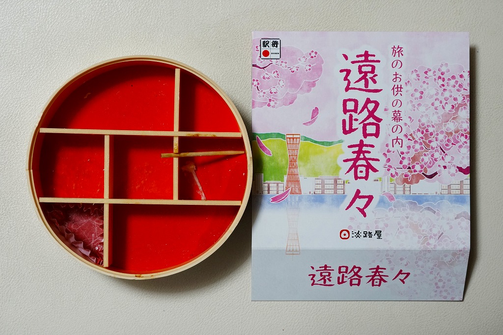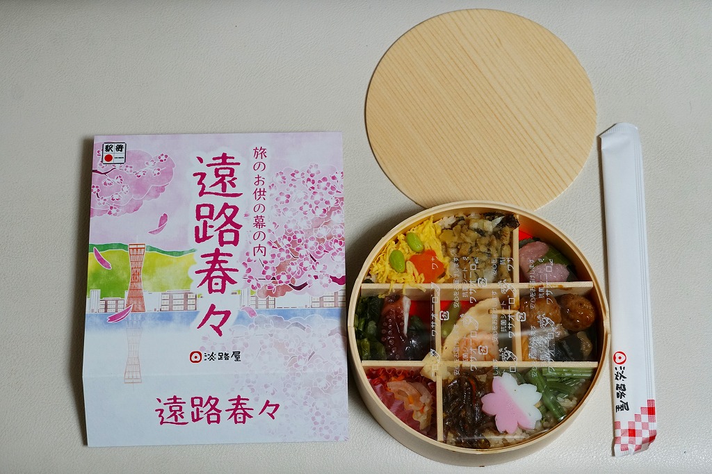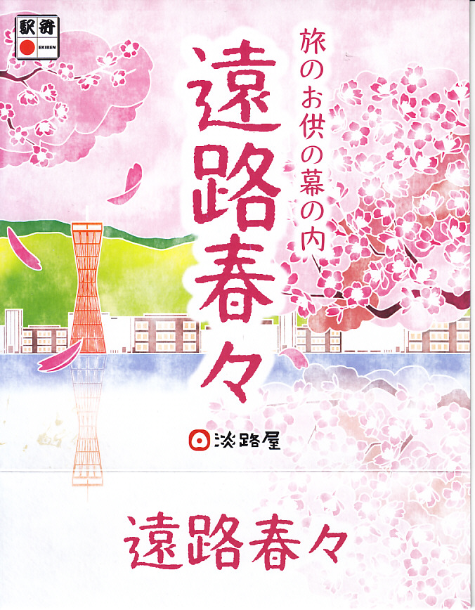 2022(令和4)年3月に発売か。丸い容器を収める四角いスリーブには、神戸市街に六甲山やポートタワーのような神戸の風景らしきものが、桜花とサクラ色に描かれる。7区画に仕切られた中身は、炊き込み御飯をくぎ煮とワラビで覆い、茶飯を錦糸卵と煮穴子で覆い、桜餅、鶏つくねと焼鮭と昆布巻、タケノコとエビといんげん、タコ煮と菜の花、きす甘酢漬。神戸の駅弁で定評のあるおかずが、少しずつ入る感じ。「旅のお供の幕の内」の副題があり、幕の内弁当という感じは受けなくも、機能としては幕の内駅弁と同じように使えそう。この春のみの販売か。