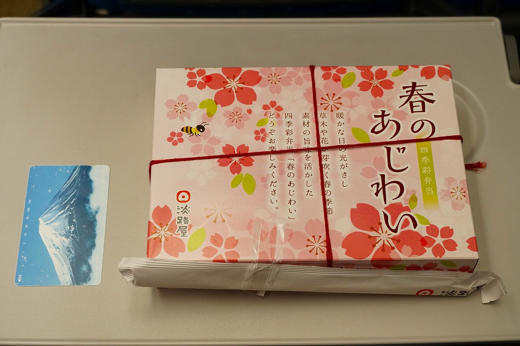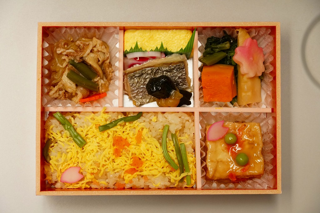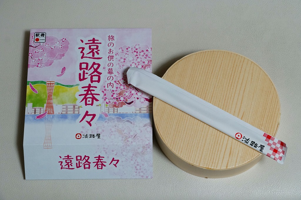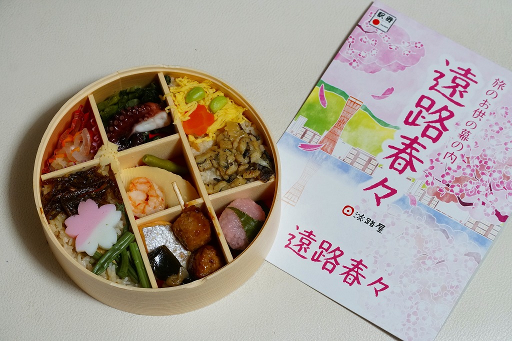 2015(平成27)年の春に発売か。中身は錦糸卵と山菜などで覆う茶飯、焼サバと玉子焼と花れんこんと昆布巻、牛肉煮、揚げ出し豆腐、菜の花とカボチャとタケノコなどの煮物。しっかりした中身に少しだけ、桜花のふたの絵柄でたっぷりと、春を感じさせている、機能的なお弁当。その前年の秋からの「秋のあじわい」や、冬からの「冬のあじわい」と同じく、京阪神エリアの直営店と駅弁売店で、手広く売られる。価格は2015年時点で880円、2020年時点で900円、2022年時点で950円、2024年時点で980円。