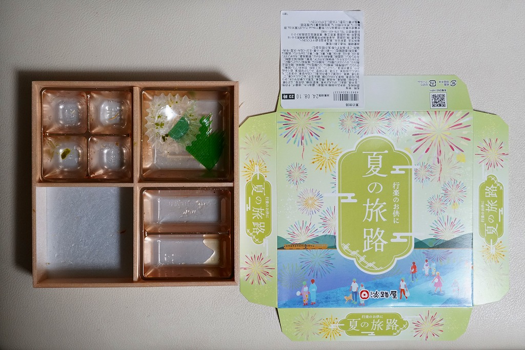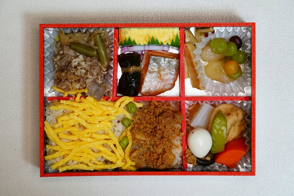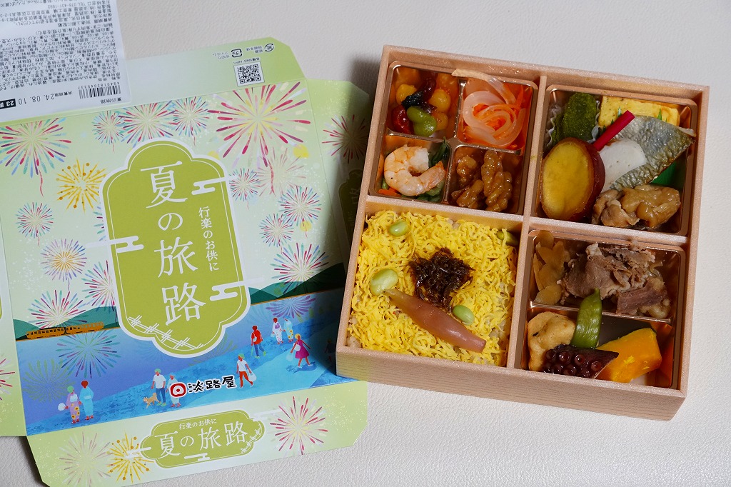 2022(令和4)年の6月に発売の夏駅弁か。ふたには海岸と花火と列車などのイラストを載せた。中身は松花堂弁当のような4区画に、みょうがと枝豆とちりめん山椒佃煮を載せて錦糸卵で覆った炊き込み御飯、牛肉煮と生姜甘酢にタコやカボチャなどの煮物、焼アジに玉子焼に鶏肉煮にサツマイモや抹茶入りわらび餅など、くるみとマリネとえび煮や煮豆などを詰める。1,300円もする高級な弁当には見えない、夏らしさがあるようなないような、普段使いの駅弁か。関西や関東の駅弁売店で手広く売られる。