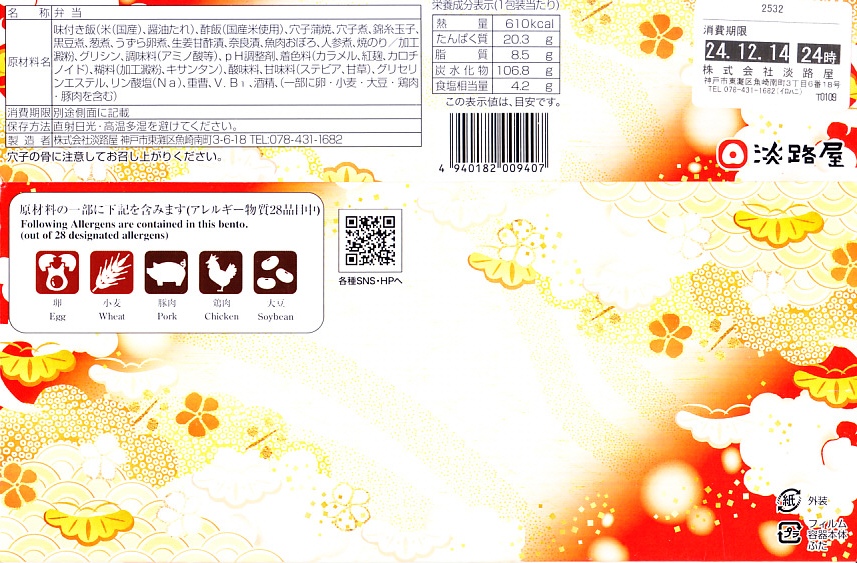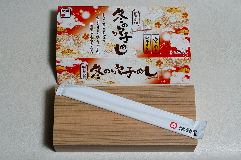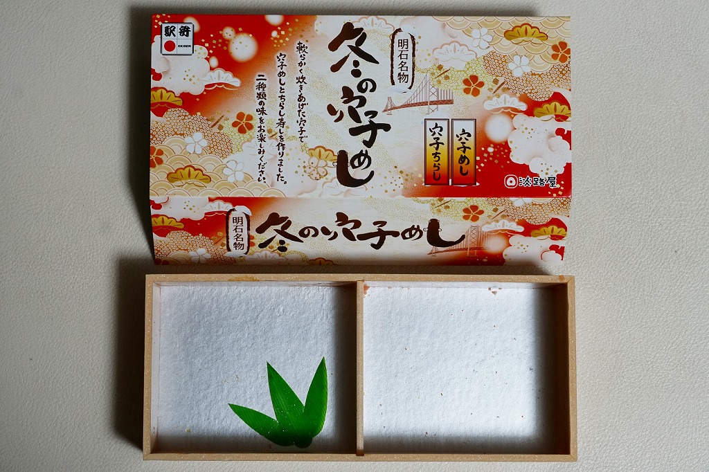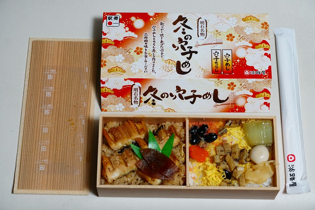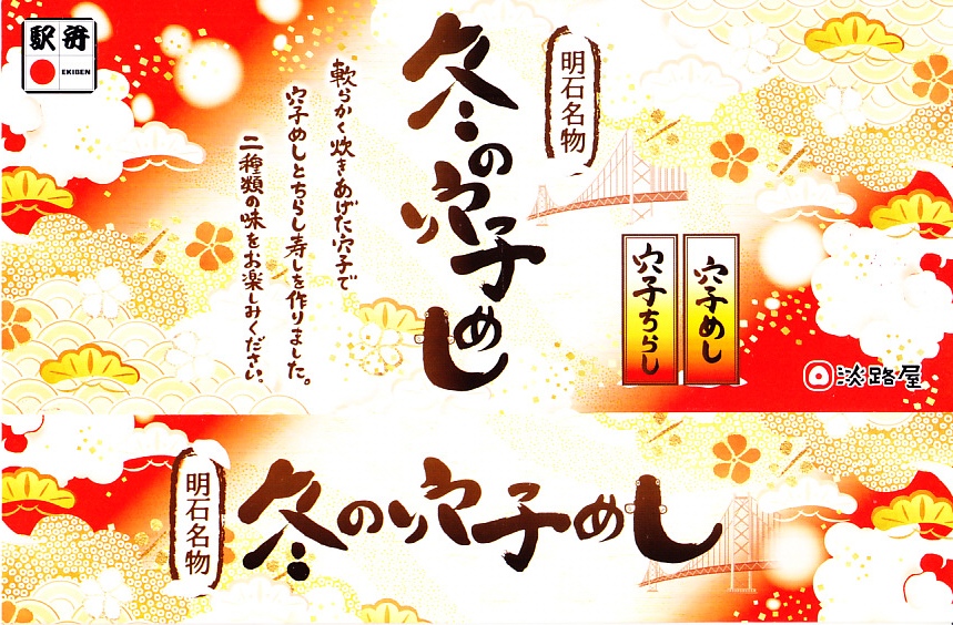 2020(令和2)年の9月頃に発売の「秋の穴子めし」、翌2021(令和3)年の3月頃に発売の「春の穴子めし」に続き、2022(令和4)年の12月頃に発売か。スリーブは橙色の暖房色をしており、アナゴのイラストを使う商品名や内容や明石海峡大橋を描く。中身は「穴子ちらし」と「穴子めし」ということで、四角い容器の一方でタレ御飯をアナゴの蒲焼きで覆い奈良漬を添え、他方で酢飯を煮アナゴとネギとうずら卵に人参と黒豆と甘酢生姜で覆う。御飯と御飯の内容で、かき込んで食べる食事に向く。12月から2月までの販売か。価格は2022年時点で1,200円、2024年時点で1,380円。