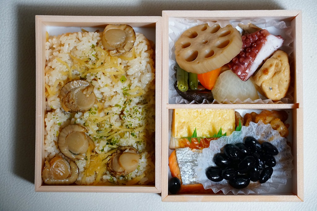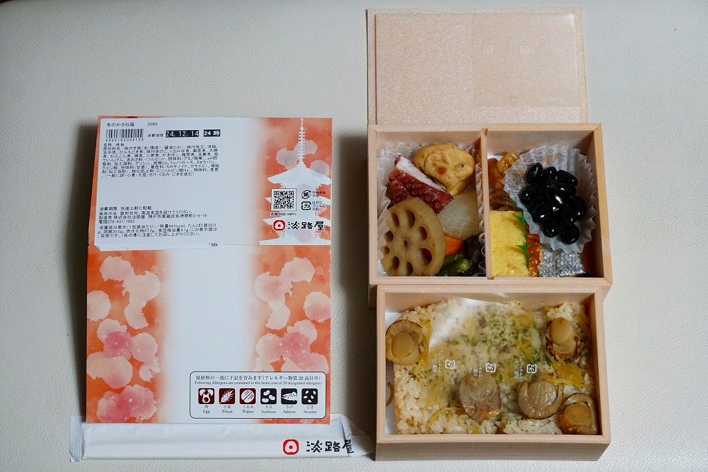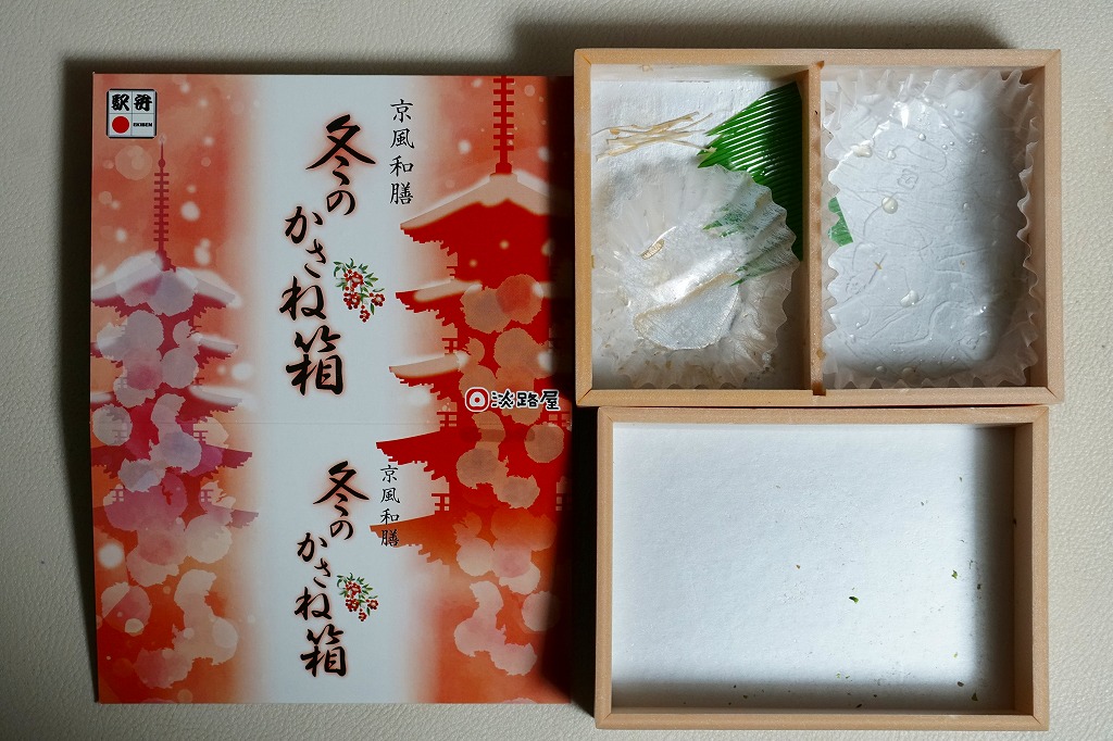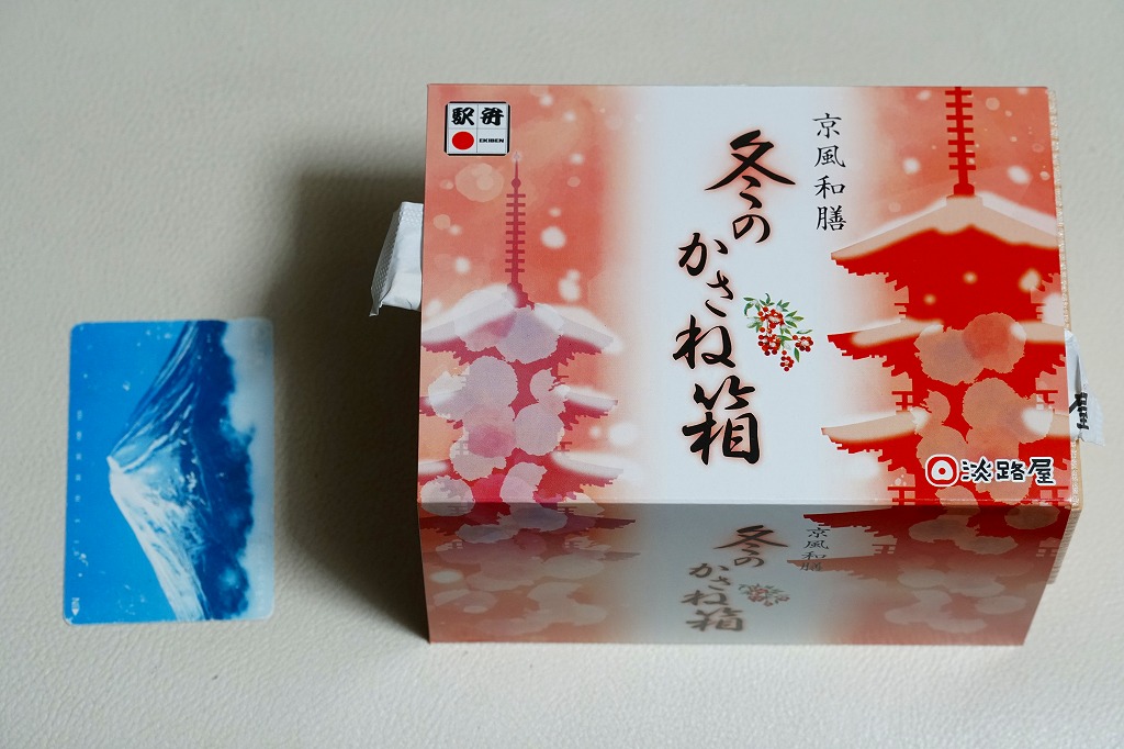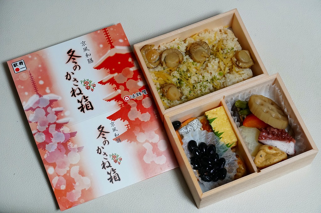 春と秋の「かさね箱」に追加して、2021(令和3)年からの冬に発売か。「京風和膳」の副題があるとおり、主に京都駅で輸送販売される駅弁、あるいは催事向けの商品かもしれない。小柄な長方形の容器をふたつ重ね、五重塔をシルエットにした赤いスリーブに収める。中身は下段が帆立と生姜を載せたご飯、上段がおかずで焼鮭、玉子焼、かまぼこ、野菜の炊き合わせ、黒豆煮、くるみ甘煮。華美でない姿に上質な食事を詰めた折箱のよう。価格は2022年時点で1,180円、2023年時点で1,380円、2024年時点で1,480円。
