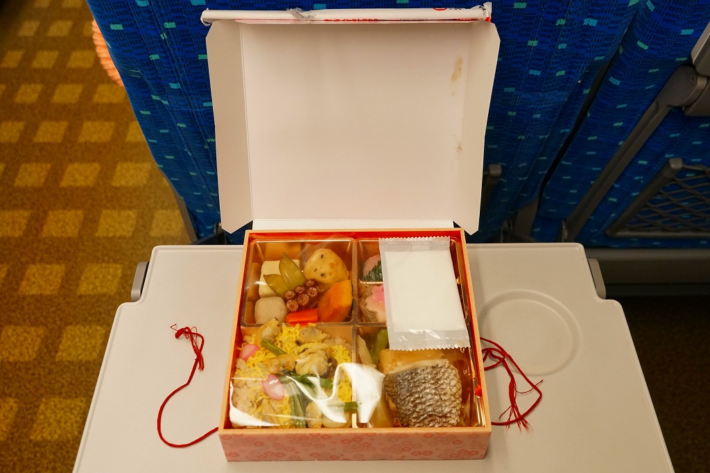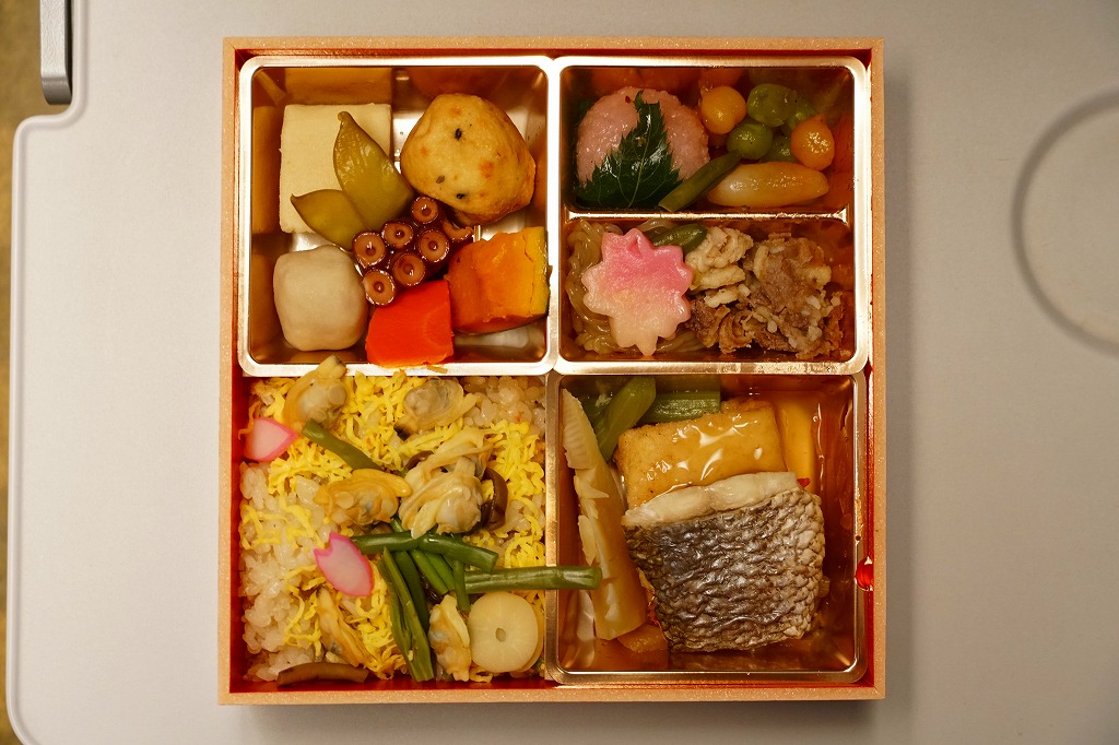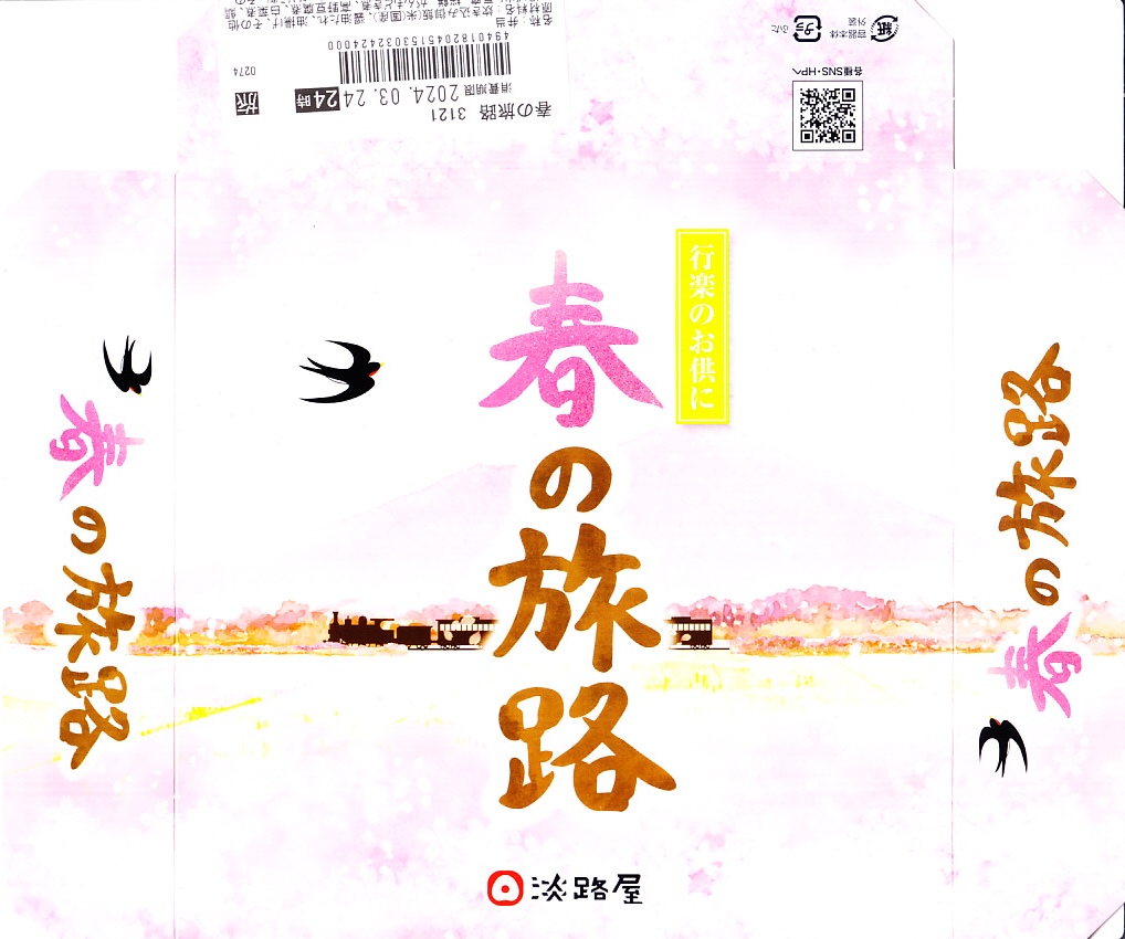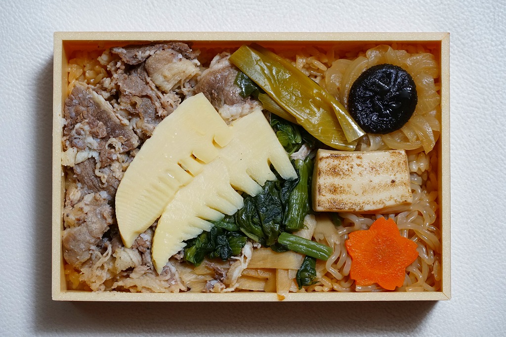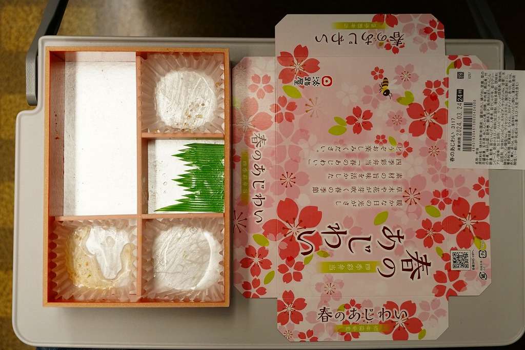 2020(令和2)年の3月に発売の春駅弁。ふたには100年くらい前の汽車とツバメと桜並木を描いたのだろうか。中身は松花堂弁当のような4区画に、アサリや山菜などを載せた炊き込み御飯、焼き魚と揚げ出し豆腐とフキやタケノコ、タコにカボチャやサトイモなどの煮物とがんもどきと高野豆腐、牛すき焼き、煮豆と桜餅。1,380円もする高級な弁当には見えない、春らしさをそこそこ含んだ、普段使いの駅弁か。価格は2020年時点で1,200円、2023年時点で1,300円、2024年時点で1,380円。