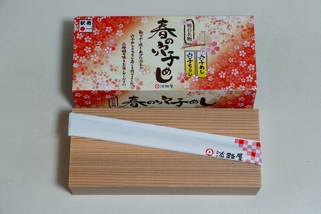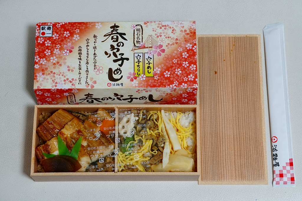 2020(令和2)年の9月頃に発売の「秋の穴子めし」に続き、2021(令和3)年の3月頃に発売。スリーブは赤の濃い春色あるいはサクラ色をしており、アナゴのイラストを使う商品名や内容や明石海峡大橋を描く。中身は「穴子ちらし」と「穴子めし」ということで、四角い容器の一方でタレ御飯をアナゴの蒲焼きとニンジンと奈良漬で覆い、他方で酢飯を煮アナゴと山菜と甘酢生姜で覆う。御飯と御飯の内容で、かき込んで食べる食事に向く。3月から5月までの販売か。9月から11月までの「秋」になると、穴子ちらしの具がくりやしめじなどの秋の味になるらしい。価格は2022年時点で1,150円、2023年時点で1,200円。