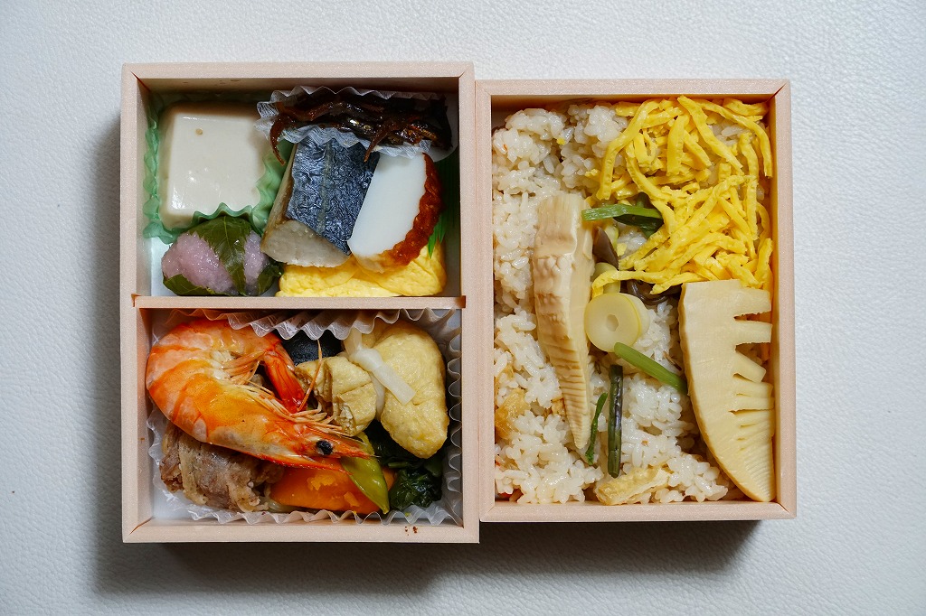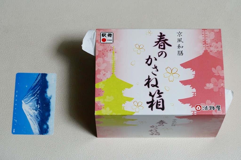 2021(令和3)年の春に発売か。2018(平成30)年の春にも売られたか。「京風和膳」の副題があるとおり、主に京都駅で輸送販売される駅弁、あるいは催事向けの商品かもしれない。小柄な長方形の容器をふたつ重ね、五重塔をシルエットにしたサクラ色のスリーブに収める。中身は下段が油揚げ御飯にタケノコと山菜、上段がおかずで、エビやカボチャや牛肉などの煮物、焼サワラ、かまぼこ、ごま豆腐、菜の花、桜餅など。華美でない姿に上質な食事を詰めた折箱のよう。価格は2022年時点で1,300円、2023年時点で1,380円。