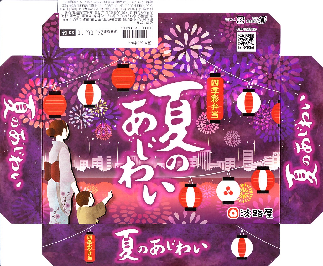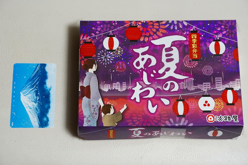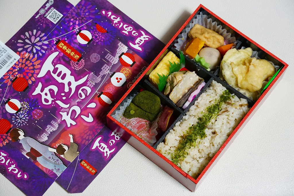 2017(平成29)年の夏までには発売か。中身はあおさ粉を塗った生姜ご飯、焼アジに鶏肉煮に玉子焼、カボチャやサトイモなどの煮物、サツマイモとえびとししとうの天ぷら、サツマイモ甘煮と抹茶入りわらび餅。しっかりした中身に少しだけ、夜景と祭りと花火のふたの絵柄でたっぷりと、夏を感じさせている、機能的なお弁当。これで「秋のあじわい」から冬と春を経て夏までの四季が揃い、関西や関東の駅弁売店で手広く売られる。価格は2018年時点で880円、2021年時点で900円、2022年時点で950円、2024年時点で980円。