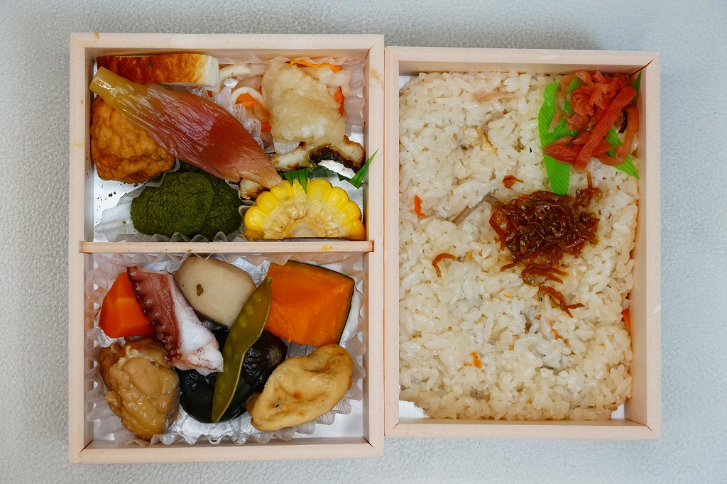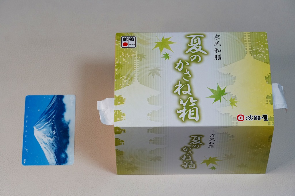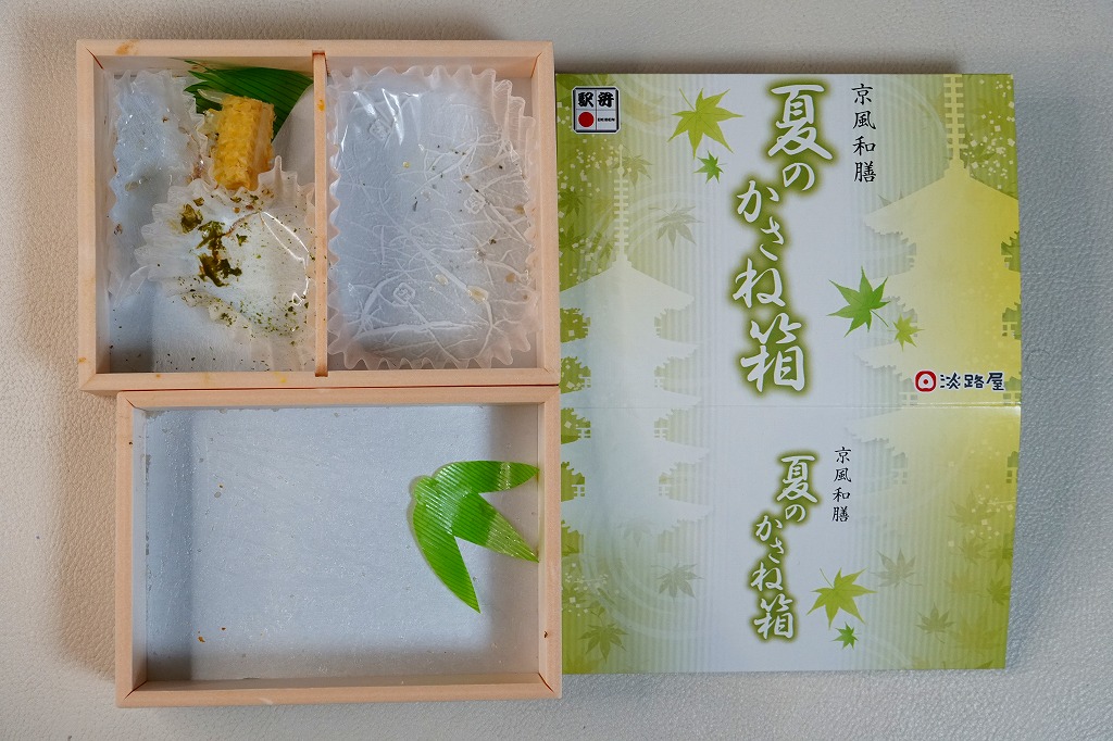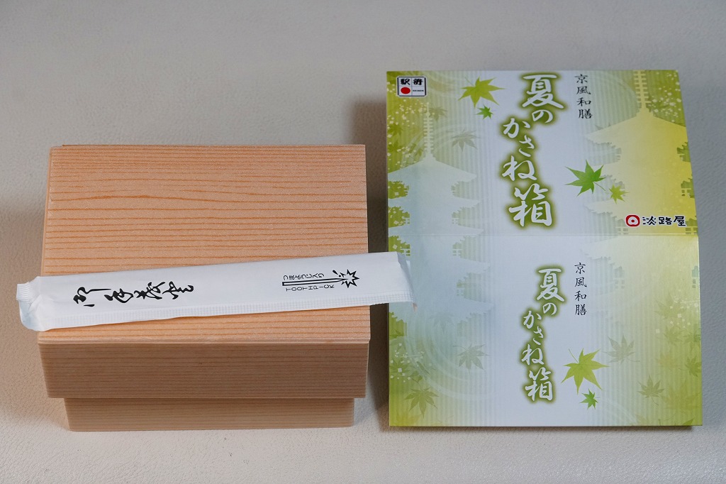 春と秋の「かさね箱」に追加して、2022(令和4)年の夏に発売か。「京風和膳」の副題があるとおり、主に京都駅で輸送販売される駅弁、あるいは催事向けの商品かもしれない。小柄な長方形の容器をふたつ重ね、五重塔をシルエットにした黄緑色のスリーブに収める。中身は下段がちりめん山椒を載せたかやくご飯、上段がおかずで、タコと鶏肉と根菜などの炊き合わせ、キス天ぷらのマリネ、ミョウガ甘酢漬、とうもろこし、あなご、揚げかまぼこ、かぶら醤油漬、抹茶わらび餅など。華美でない姿に上質な食事を詰めた折箱のよう。価格は2022年は1,350円、2023年は1,380円。