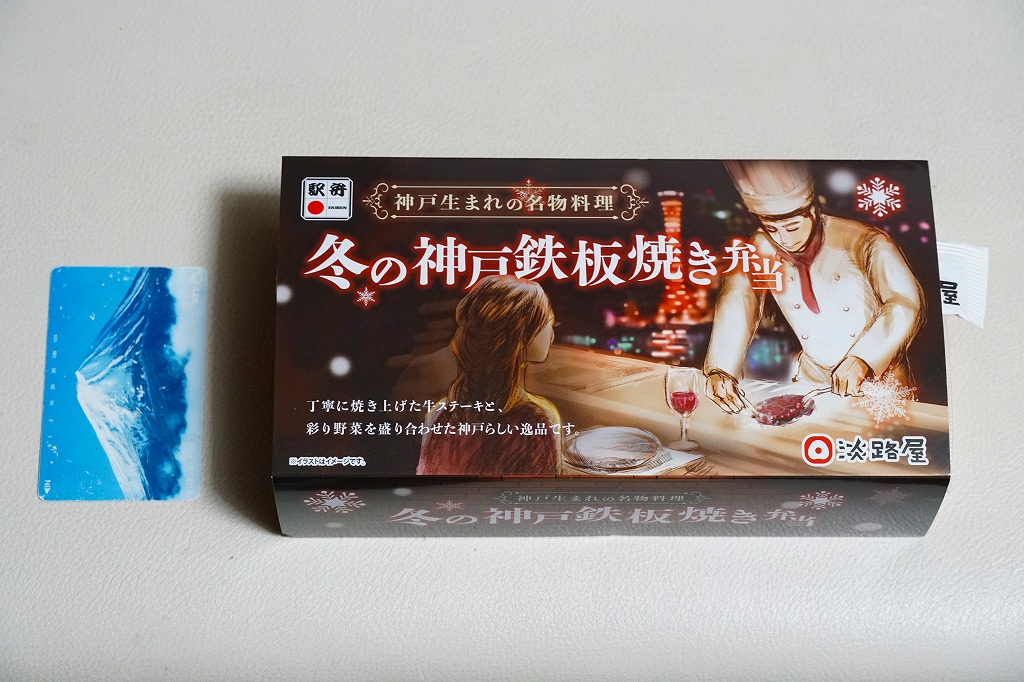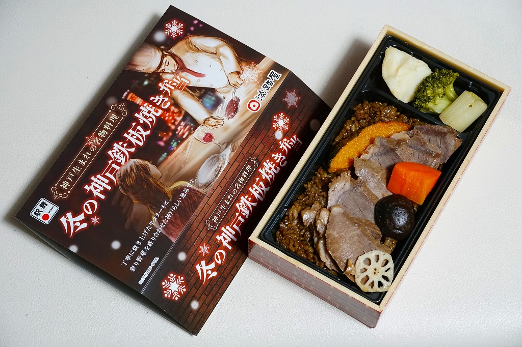 2024(令和6)年12月までに発売か。2月まで売られる冬駅弁で、2022年発売の「神戸鉄板焼き弁当」の冬バージョン。容器や中身のつくりはそれと同じで、スリーブの文字が冬と光の色になり、牛ステーキ弁当の具をかぼちゃ、れんこん、しいたけ、にんじん、ねぎ、ブロッコリー、じゃがいもの素揚げとしたもの。通常版と変わらない、特に冬というわけではない感じの、ガーリックのステーキ丼。価格は「秋」まで1,380円、この「冬」から1,480円。