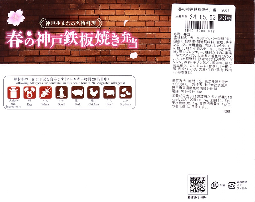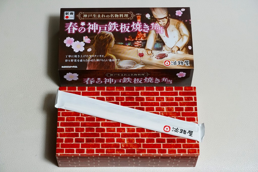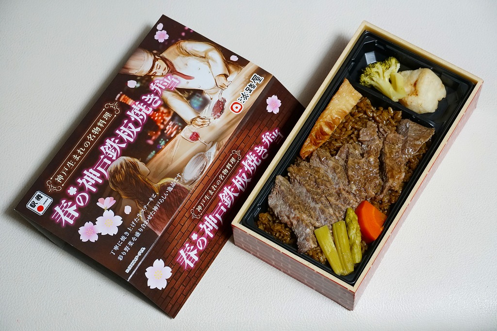 2024(令和6)年4月までに発売か。5月まで売られる春駅弁で、2022年発売の「神戸鉄板焼き弁当」の春バージョン。容器や中身のつくりはそれと同じで、スリーブの文字が春と桜の色になり、牛ステーキ弁当の具からコーンとパプリカを抜き、タケノコの素揚げとにんじんを加えた。春らしさは無いと思う、ガーリックのステーキ丼。