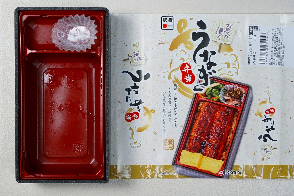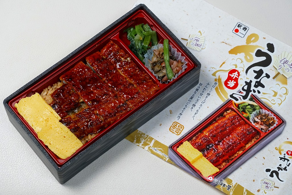 神戸駅弁のうなぎ弁当の、2025(令和7)年の夏版として、7月に発売。長方形のプラ容器に茶飯を詰め、ウナギの蒲焼きと玉子焼きで覆い、小松菜とにんじんのおひたしと、かぶら醤油漬を添える。特長も特徴もないウナギ弁当にみえて、ウナギの価格が暴騰して約20年、それ以前に全国各地で定番の駅弁であったうなぎ弁当が消えたりコストを意識し変質したりしてきたことを思うと、掛紙を使ってこの値段で、こんなに普通なウナギ駅弁に出会えて良かったと感じた。東京駅など関東地方でも販売。
