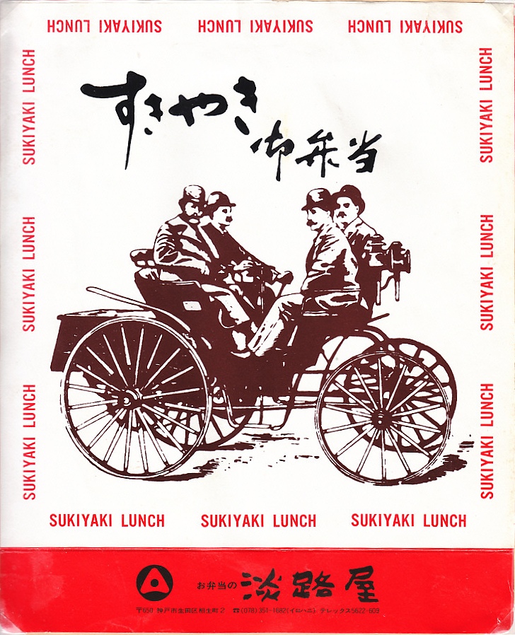 昭和50年代頃のものと思われる、昔の神戸駅弁の紙箱の一部。調製元の所在地が生田区なので、1980(昭和55)年より前のものだろう。神戸の開港時や日本の開国時を思わせるような、当時の表現でいう異人が乗る四人乗りの馬車に見えるイラストを使う。この調製元の名称に駅名が併記されていないため、駅弁でなく市販か仕出しの弁当向けの容器かもしれない。